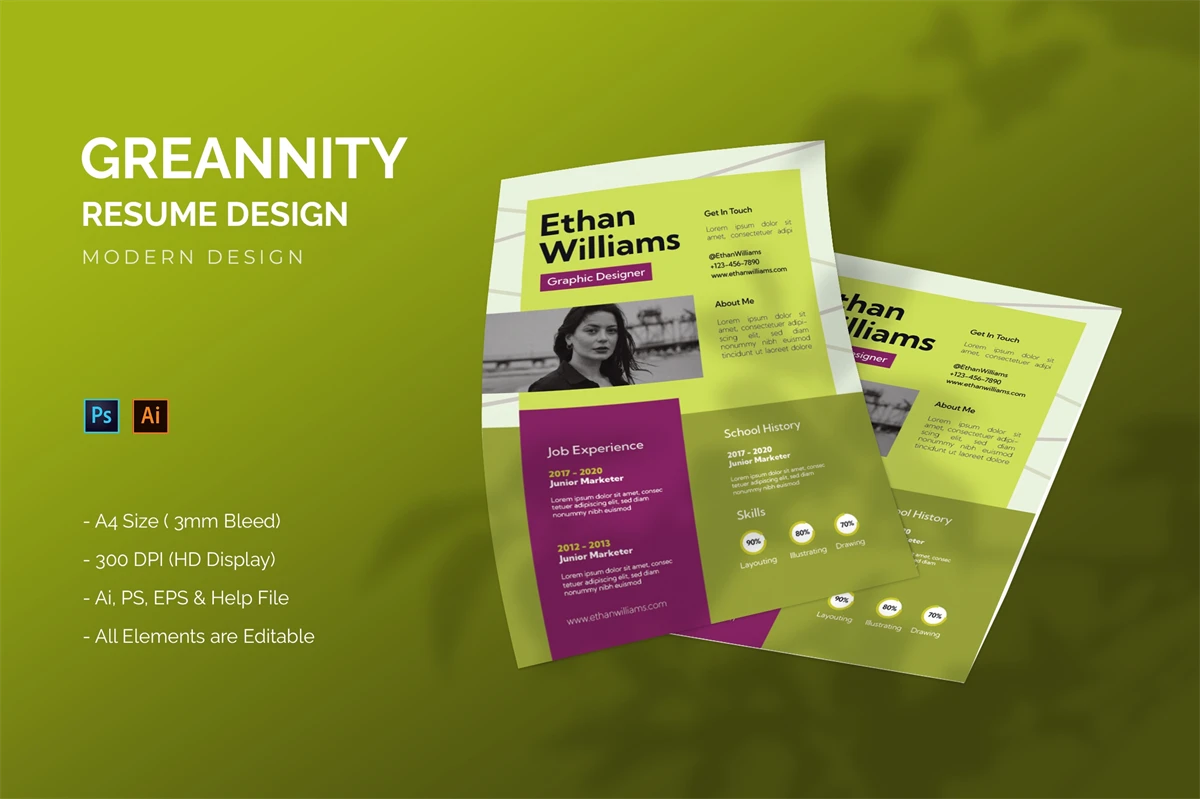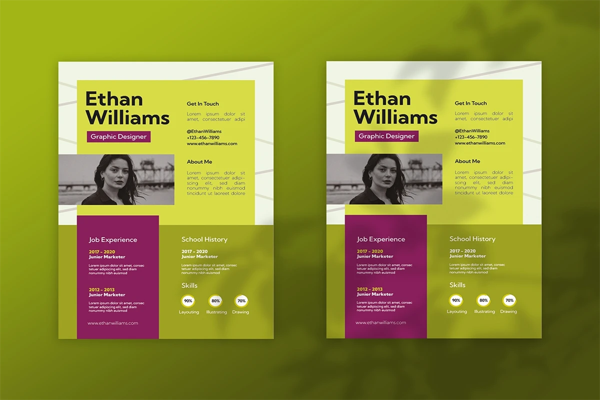This CV resume design template lets you tell your story to potential employers or collaborators by showcasing your skills, experience, and accomplishments. It presents your credentials clearly and professionally to draw attention and highlight your strengths.