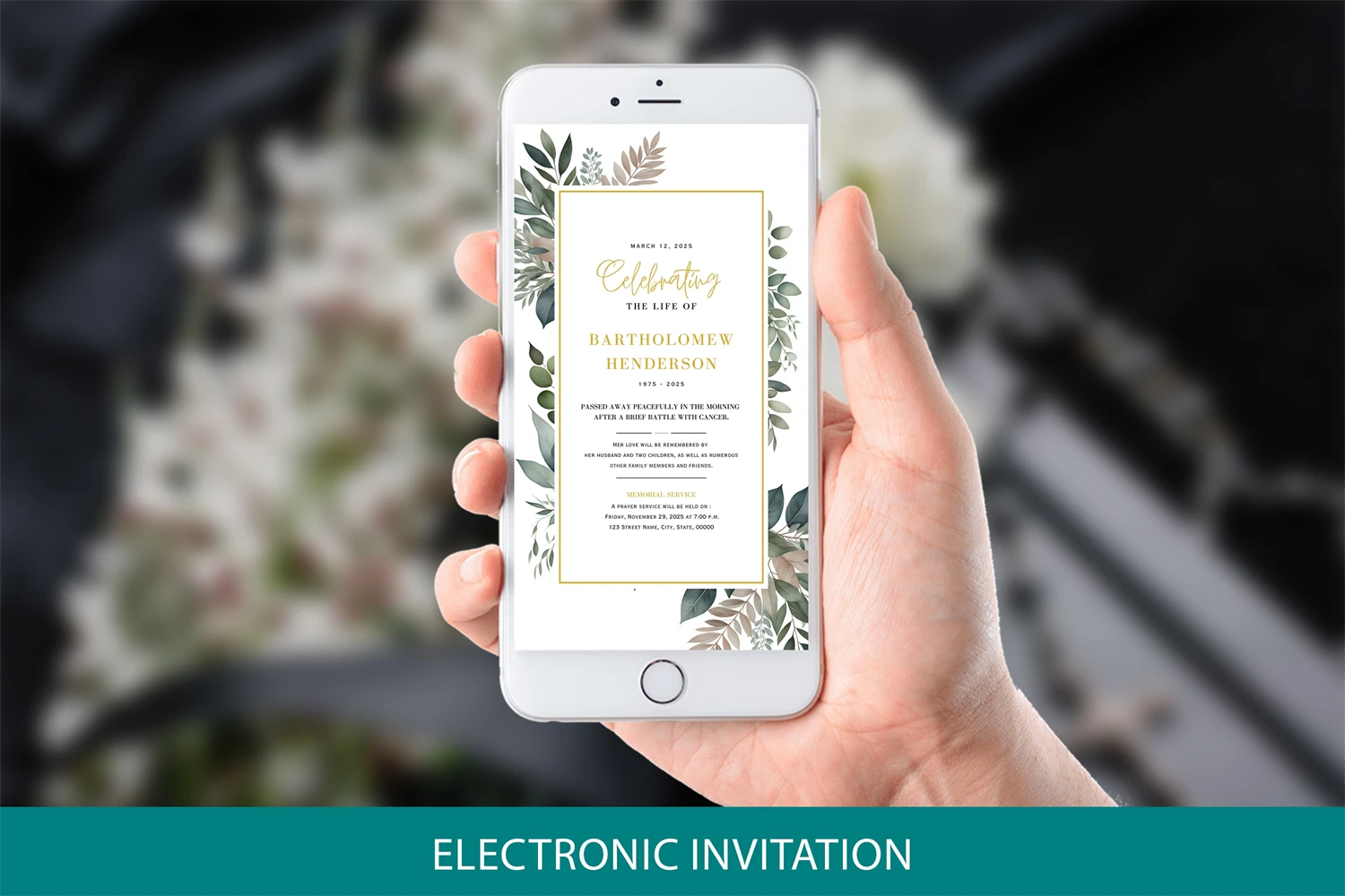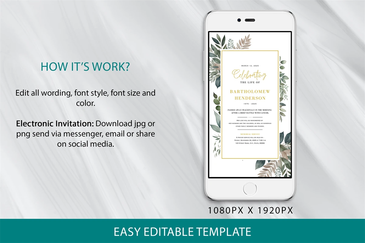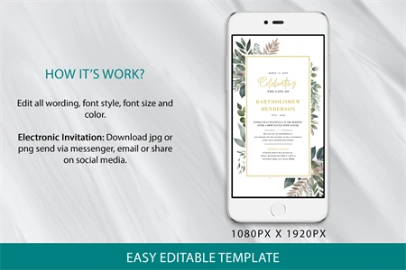 Editable Greenery Funeral Electronic Invitation Template! You can edit this template instantly without the need for any additional software.