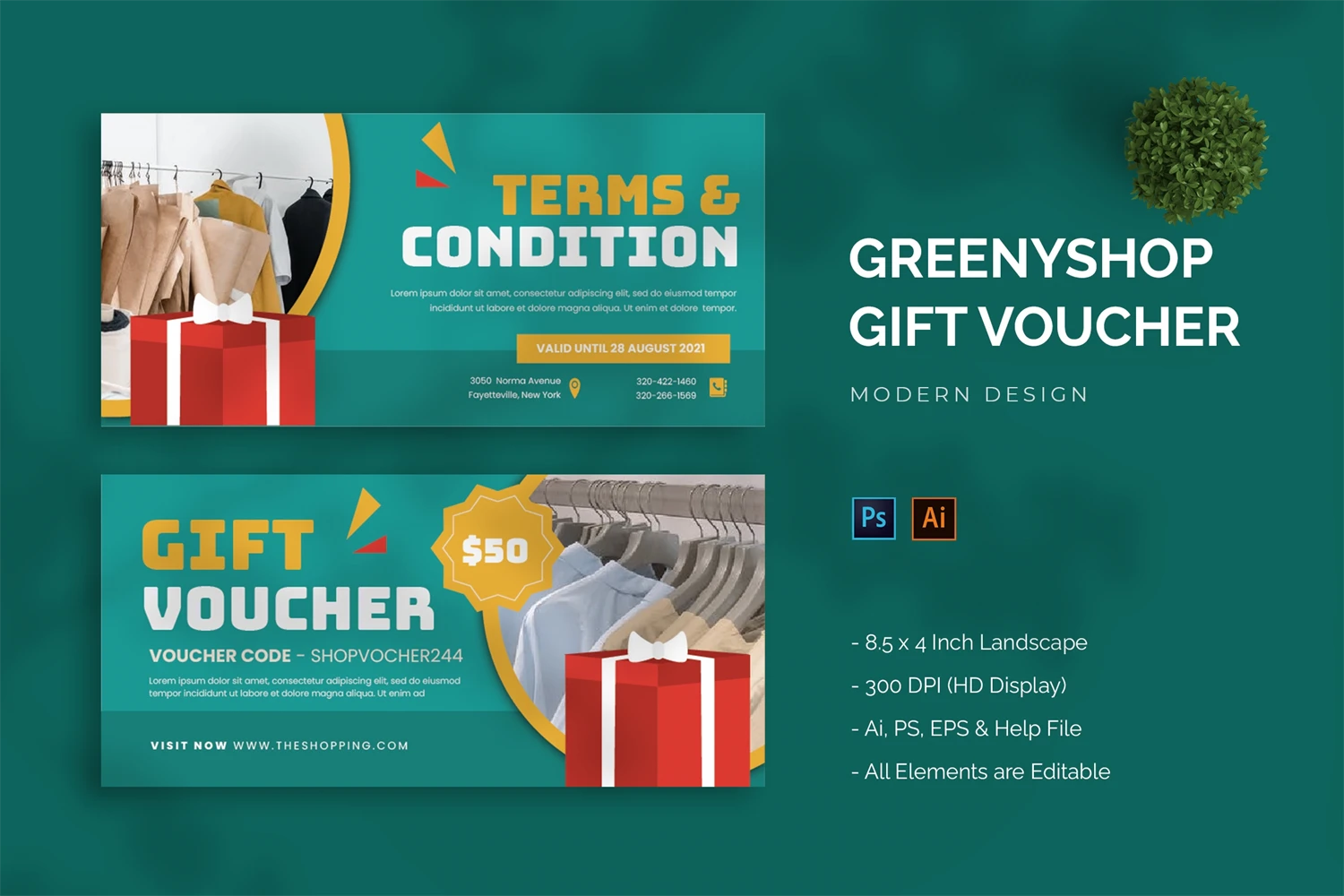 This is a Greenyshop - Gift Voucher Get it now and don't miss it!, a Gift Voucher for all your business and personal needs. Great for your business and this design will keep you interested, elegant, and easy to edit according to your needs (** Adobe Illustrator, Adobe Photoshop **). You can use this Gift Voucher for your business, event or other publishing like marketing promotions and company profile, and you can also use this gift voucher to your clients and family, I hope you enjoy this, Hope you like it don't forget to rate, Thanks.