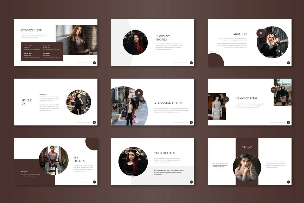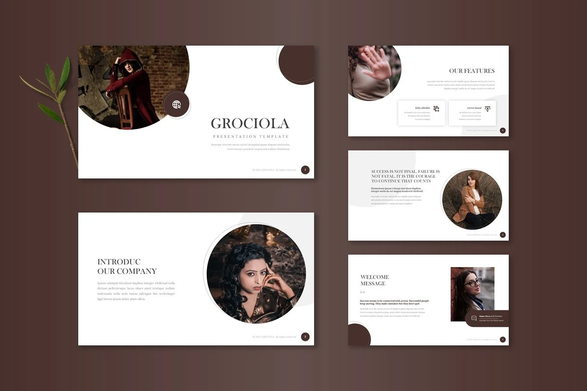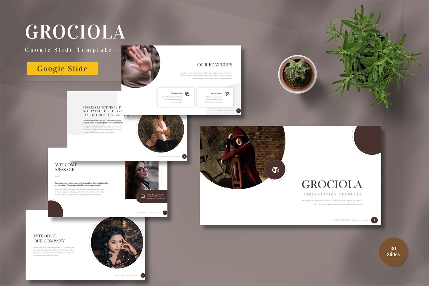 Get it now! **Grociola - Google Slide Template** for All Business and Personal Needs All elements on this template are editable; input your content, replace your image with a placeholder, change the color, and all presentations include an animated slide to present your slides.
