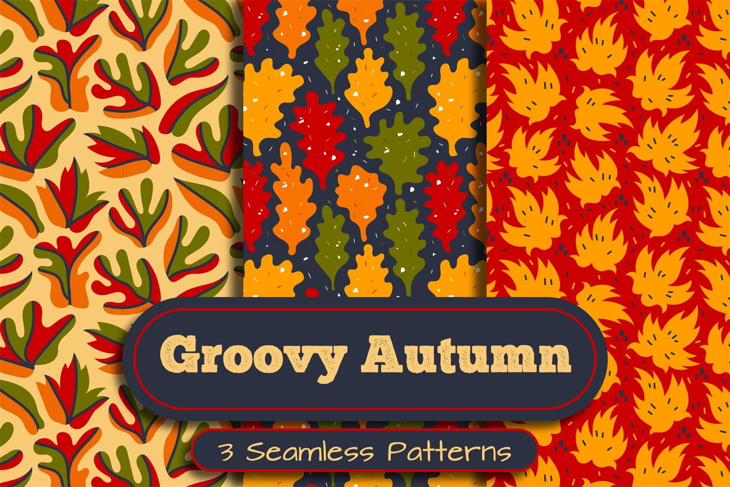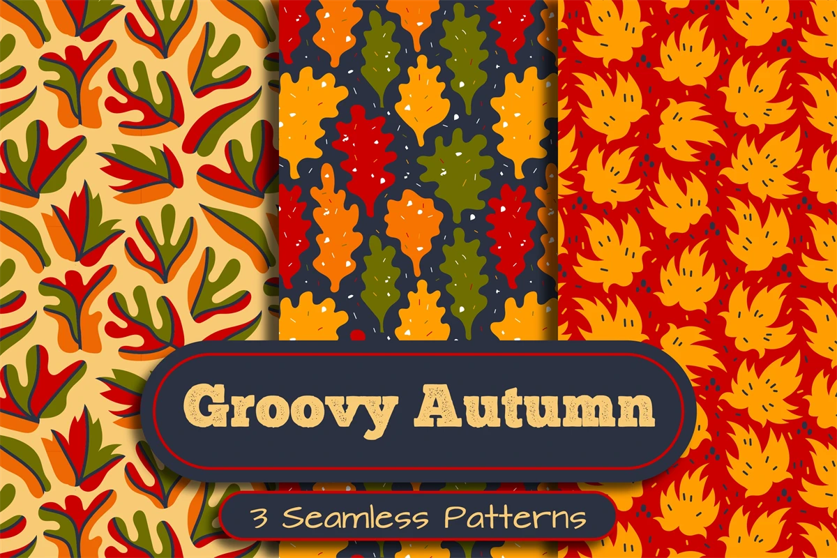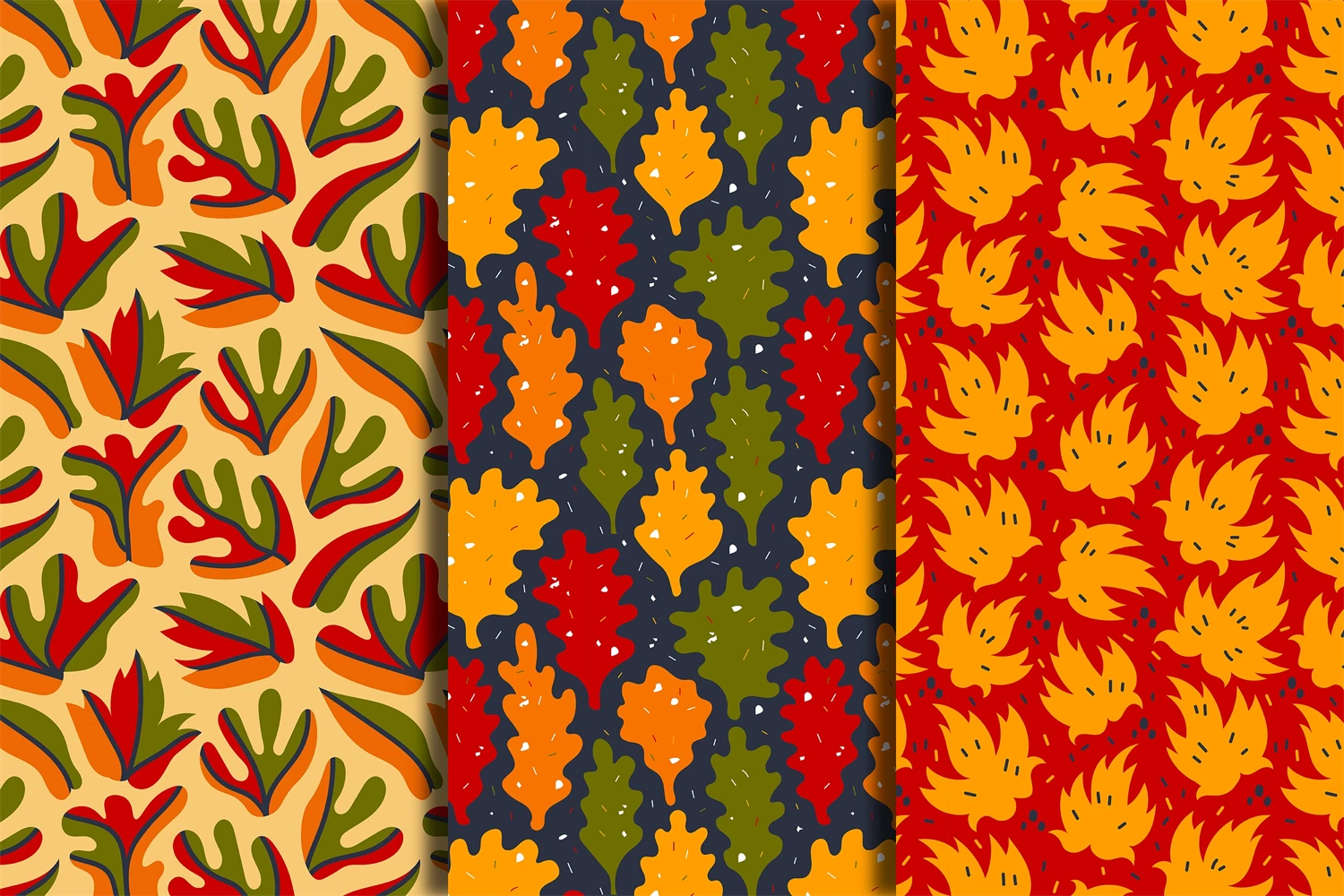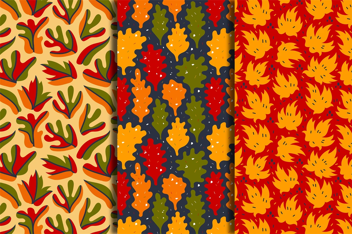 Hand-drawn groovy collection of 3 cozy seamless patterns with yellow, red and orange leaves. Doodle leafage endless backgrounds for seasonal design. Set of cute digital papers with oak, maple and abstract wavy foliage. Fall design for fabric, textile, wrapping paper, holiday, greeting card, wallpaper, etc. Henry Matisse inspired contemporary botanical art in minimal textured style. Vector illustration.
