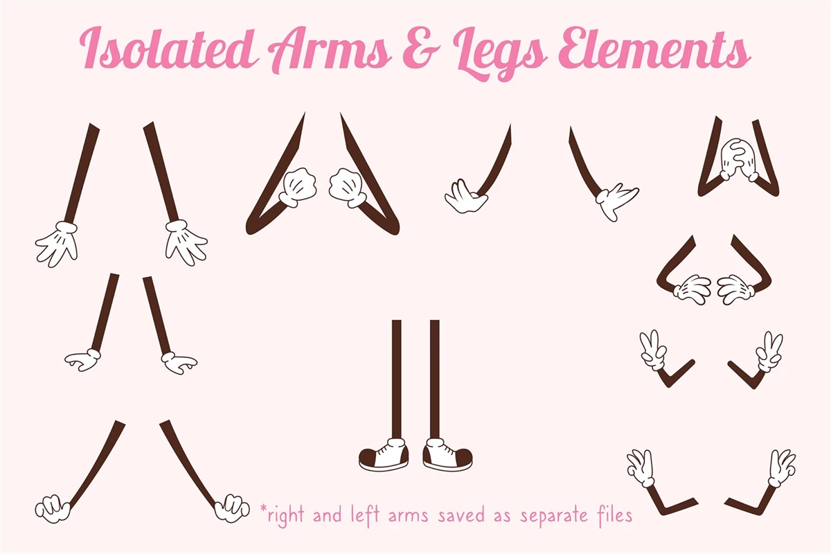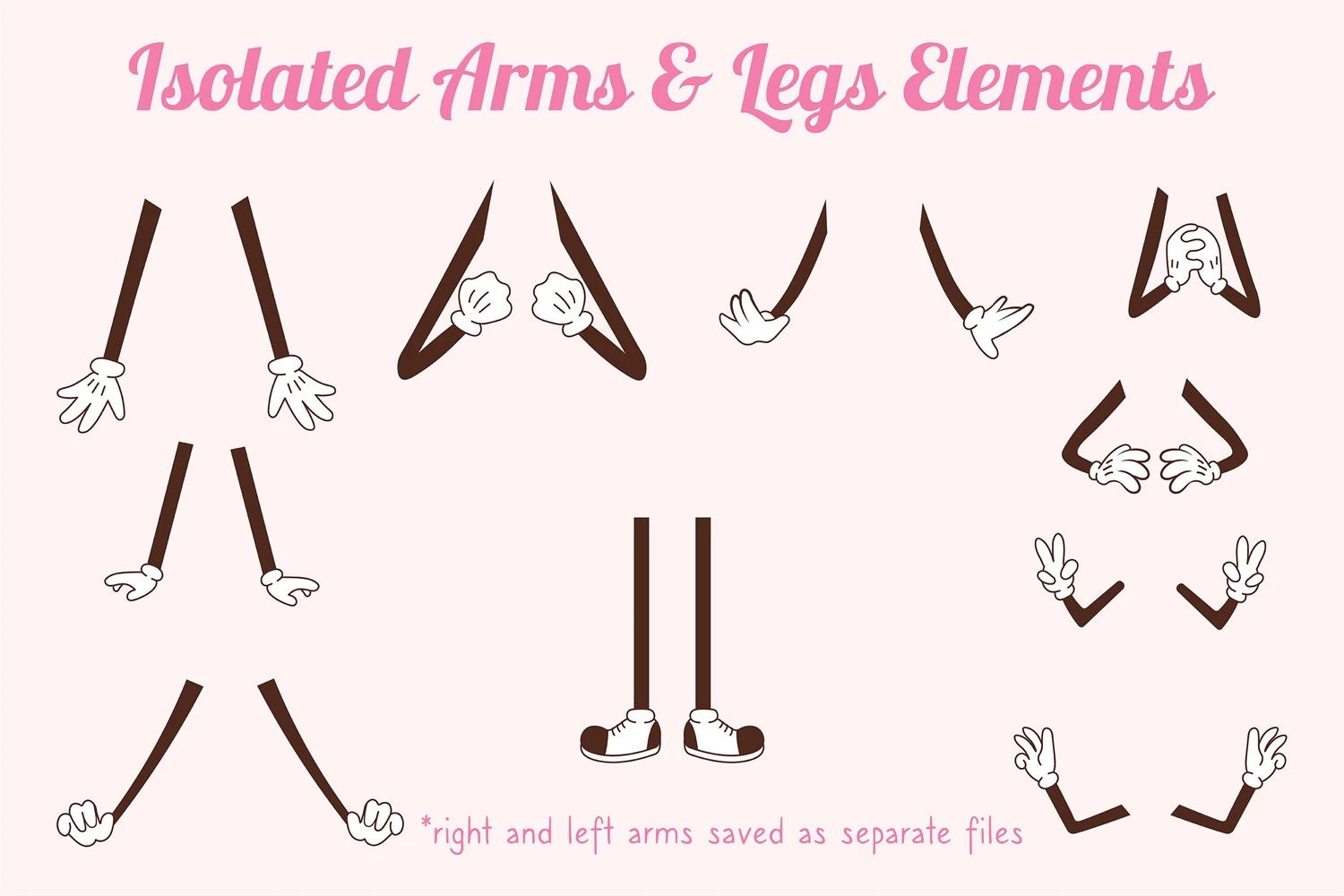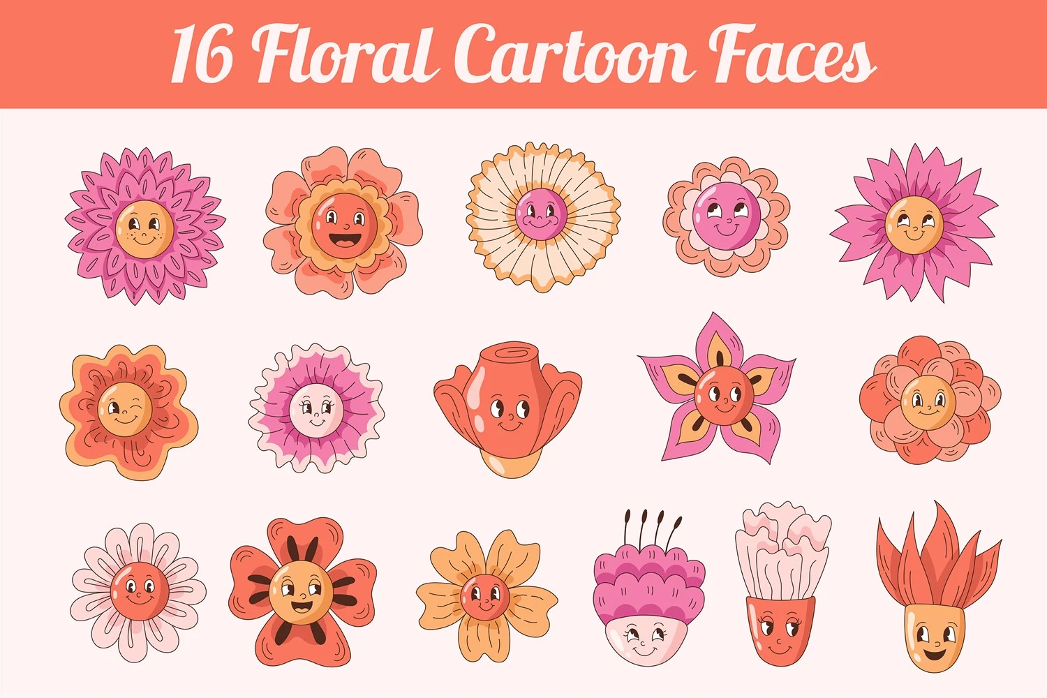 Groovy Flowers Constructor includes 16 cute hand drawn floral cartoon faces with eyes and smiles and 18 legs and arms isolated elements in trendy retro style to create your own characters. Old style gloved hands and funky blossoms heads with funny facial emotions are perfect for mascot, cards making, greeting card, party, birthday, poster, kids, stickers, modern decoration, florist, flower shop, t-shirt print, sublimation, festival, celebration, etc.