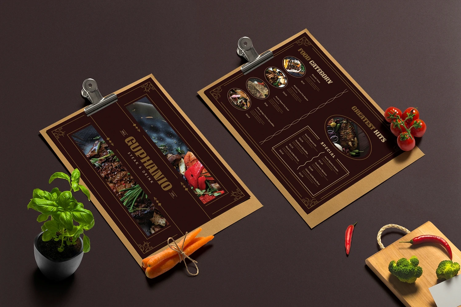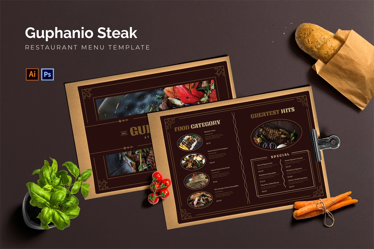 Guphanio Steak - Restaurant Menu. This template is great for your business and will make your customers interested, elegant, and easily editable according to your needs, this restaurant menu is perfect for, promos, cafes, hotels, resort shops online. etc. I hope you enjoy this restaurant menu
