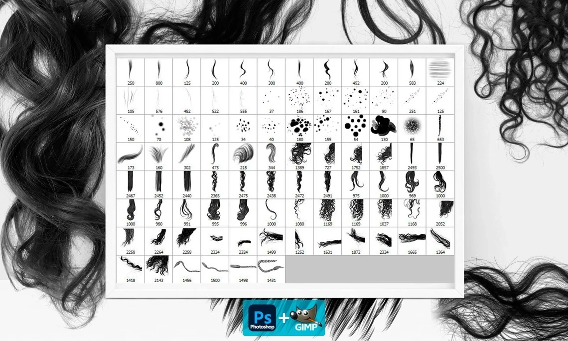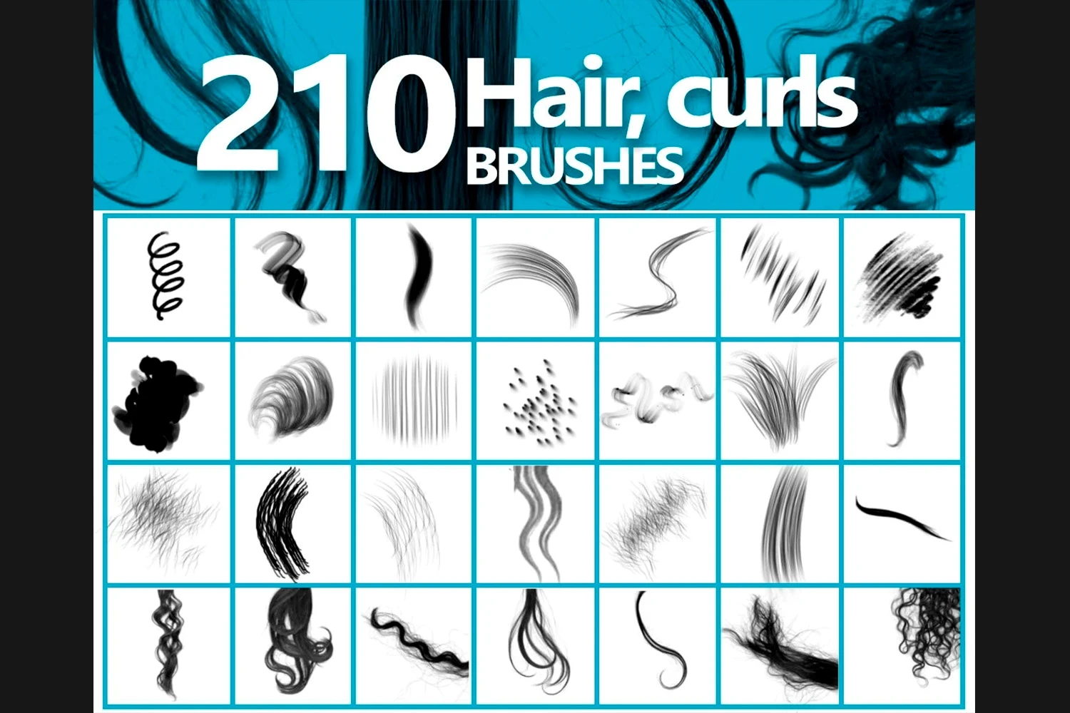 This set includes 210 excellent quality Photoshop themed brushes that you can use in your design ideas. This set includes images and elements for drawing and editing: hair, strands of hairs , curls, painted hair, wigs