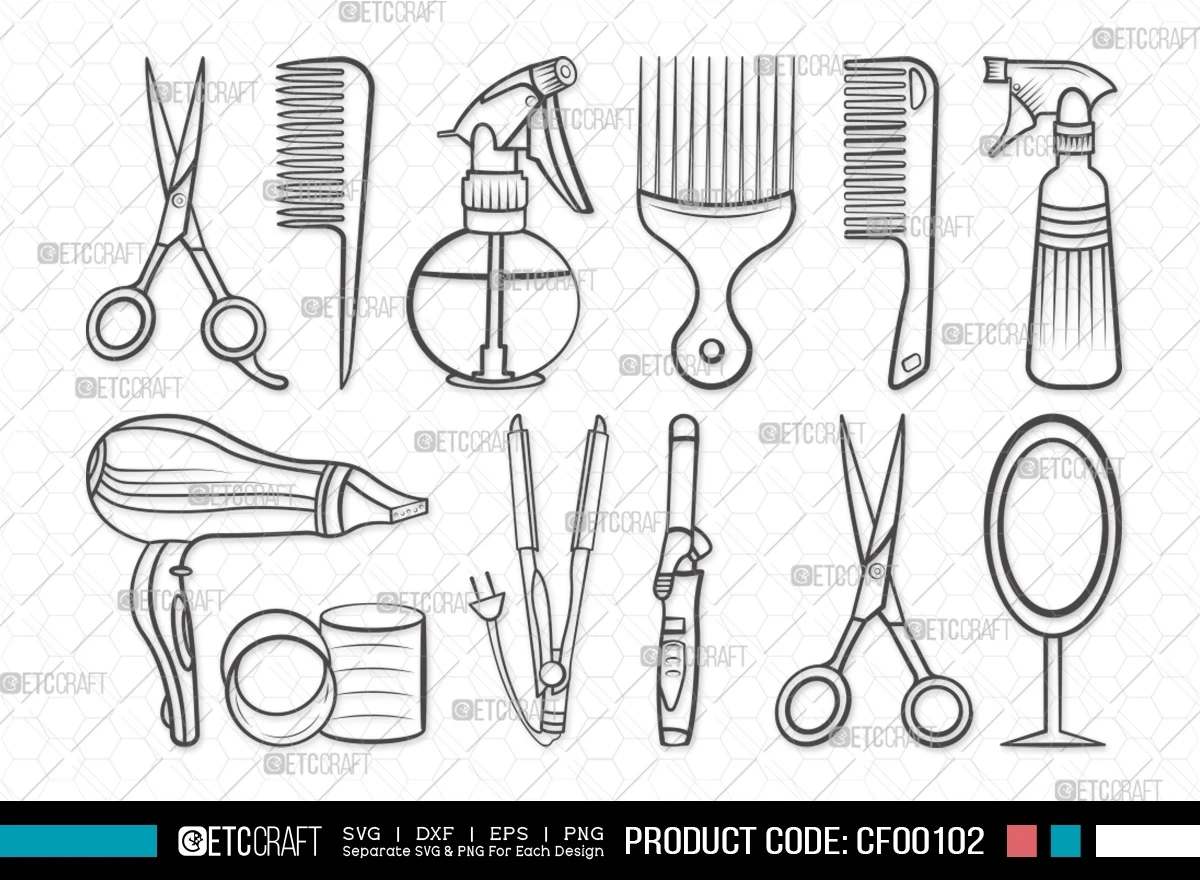 Upgrade your hairstyling creations with the elegance of our Hair Salon Outline Barber Tools SVG Cut File Bundle. Download it now and add a touch of glamour to your hairstyling and crafting projects. Don't miss out on this opportunity to showcase your passion for hairstyling in a truly unique and artistic way!
