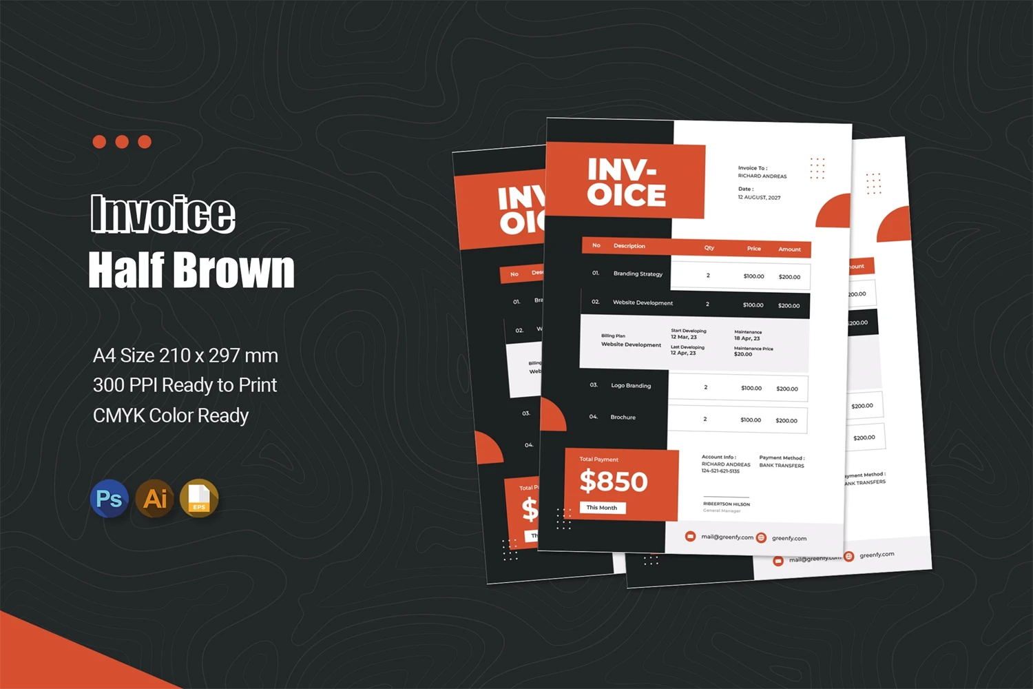 Use our invoices to make your bookkeeping easier and to impress your clients with an invoice display that has a modern, elegant design and strong typography. This invoice template is easy to use and customizable, making it perfect for any medium.