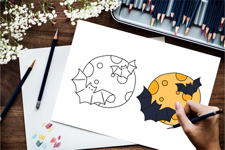 4 coloring pages for the youngest Halloween theme. Cartoon pictures of moon witn bats, black witch castle, witch hat, Mushroom Amanita.