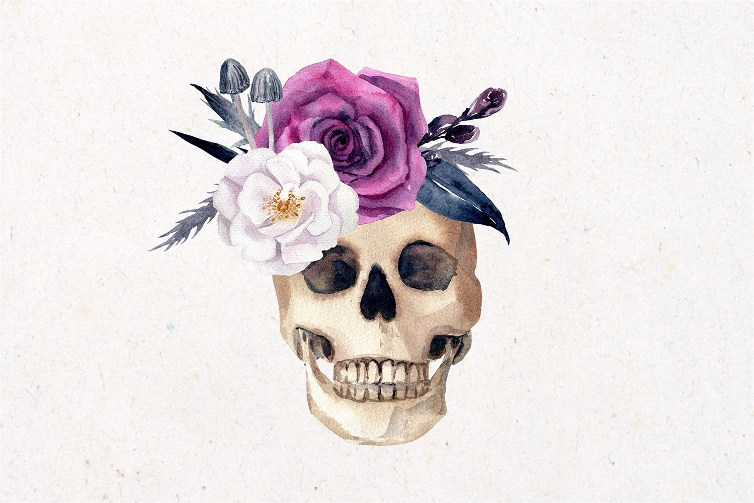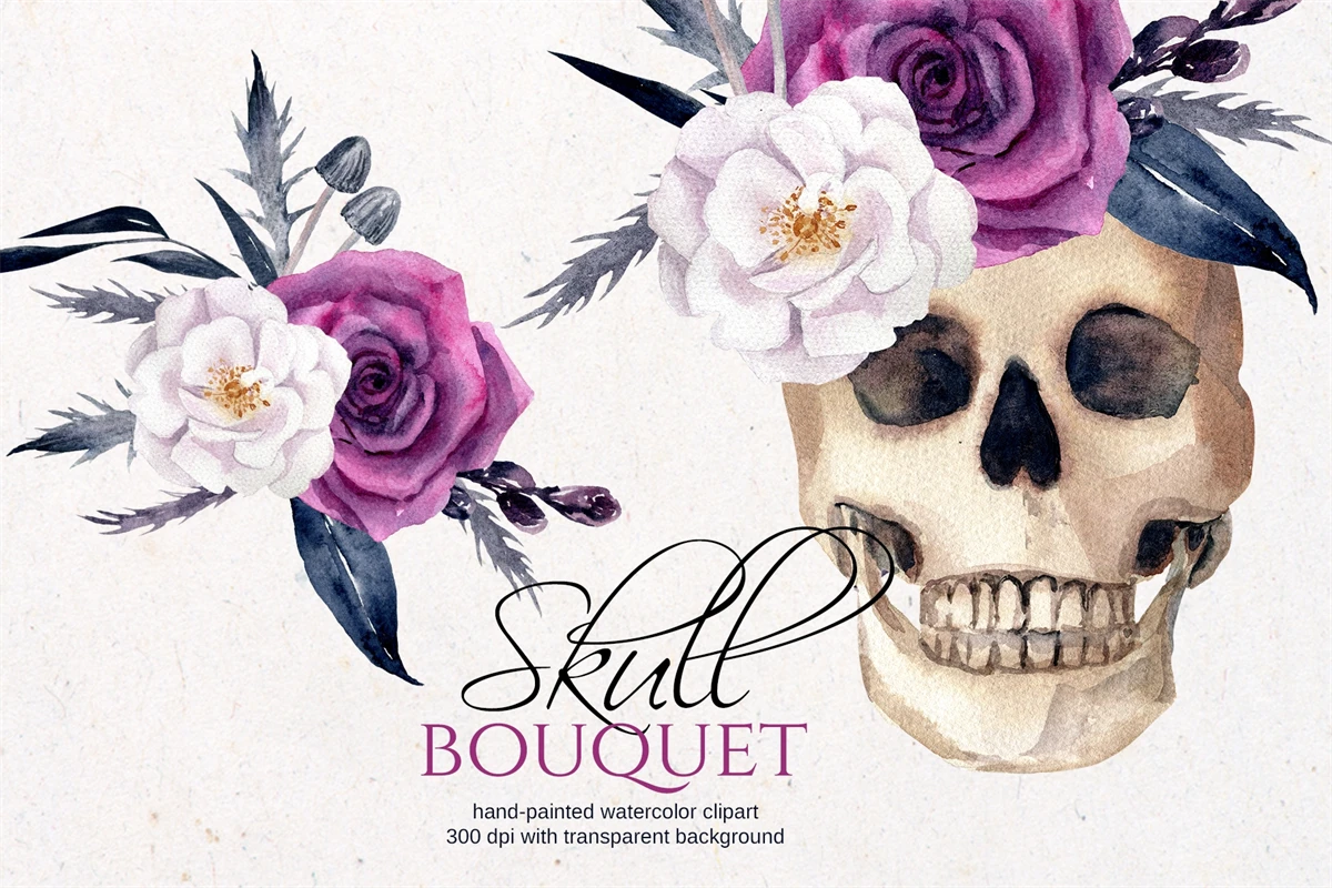 Watercolor halloween compositions clipart with skull, plants, branches, flowers, anemones, in black gray and brown colors. For your unique invitations, gothic wedding, birthday party and more