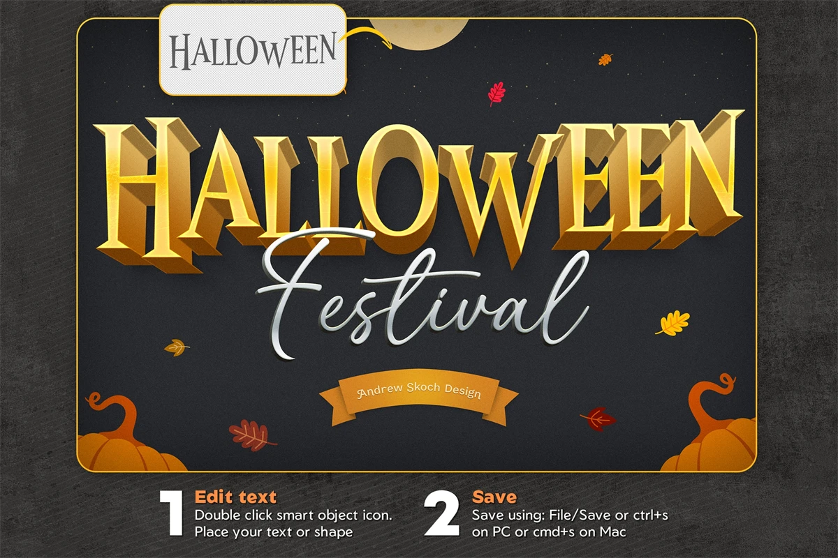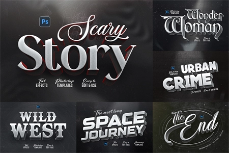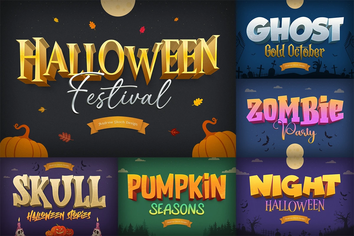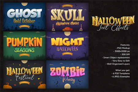 Get 6 Photoshop templates with festive text effects. Halloween text effects for your October graphics. Make ads for your sale campaigns!