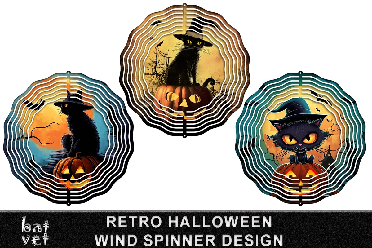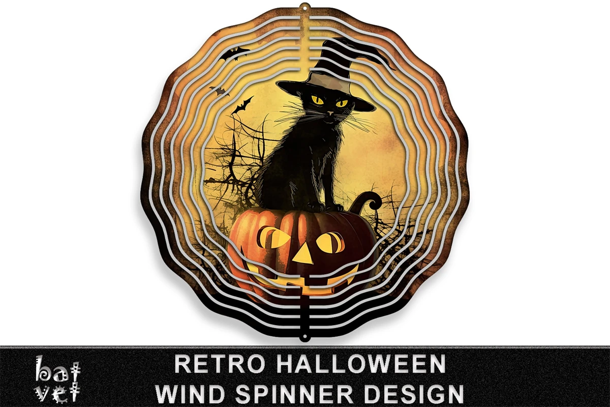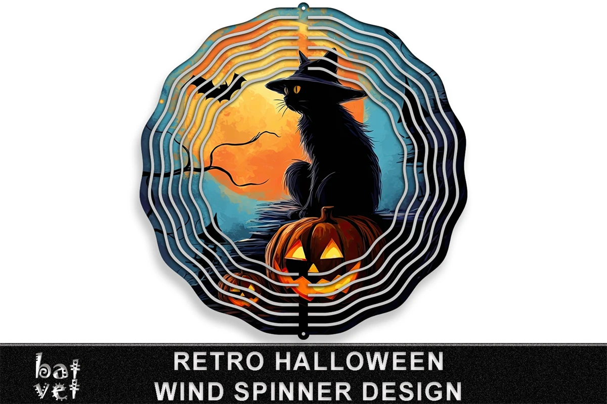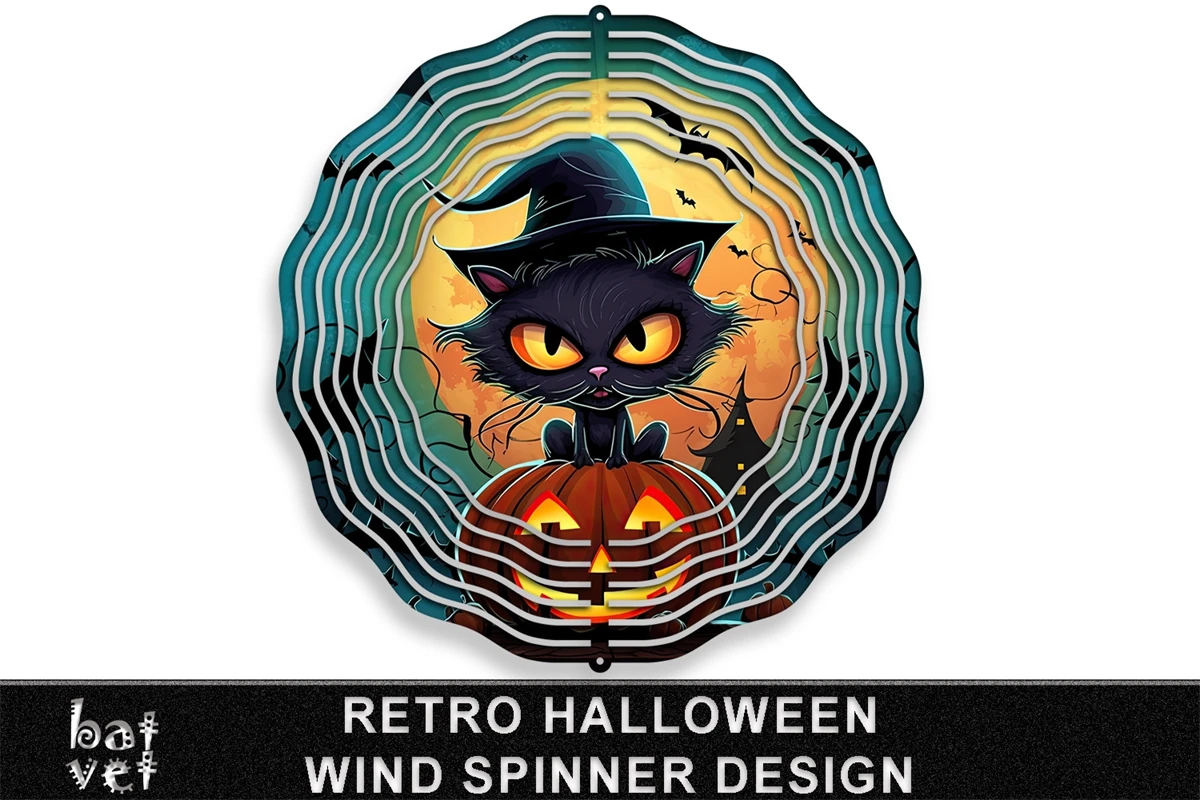 Garden Decor Wind Spinner Halloween Theme, Black Cat and carved Pumpkin Sublimation Design.