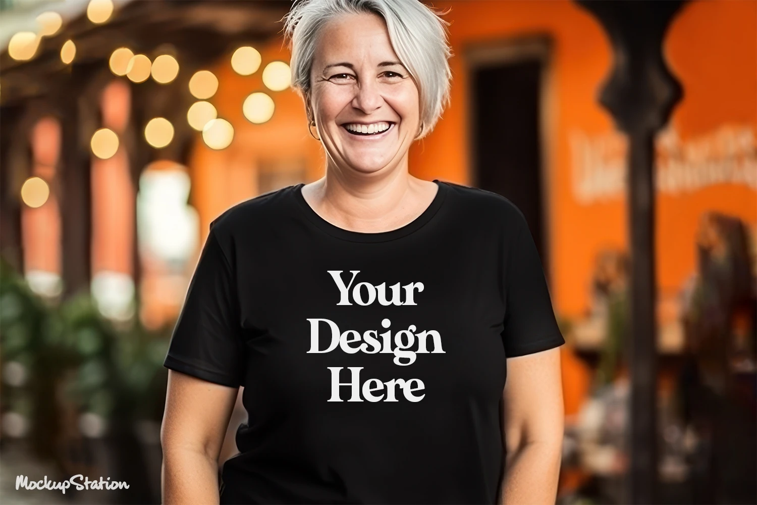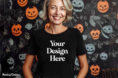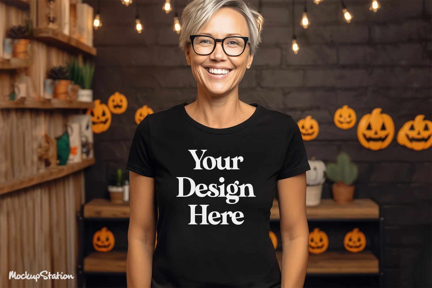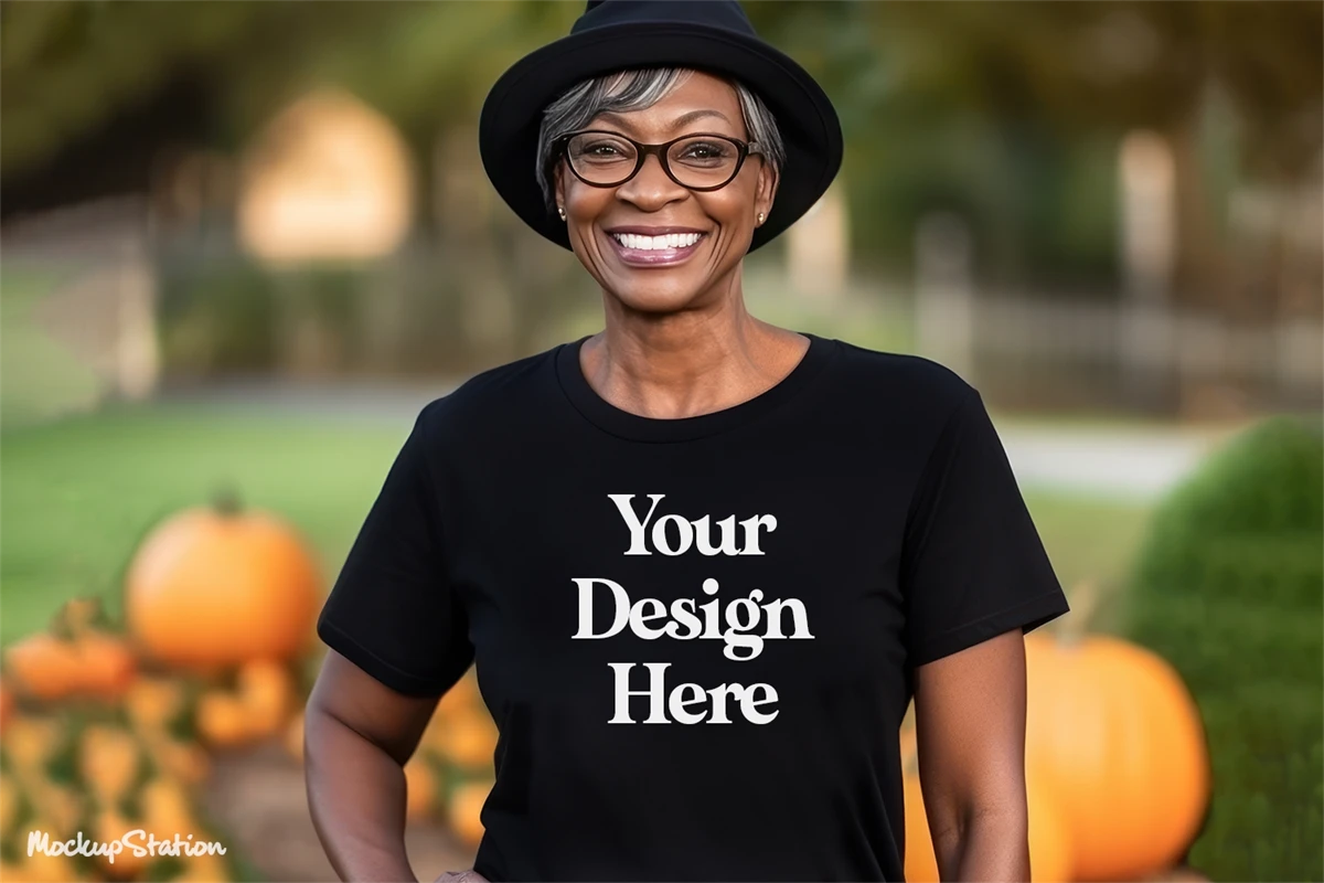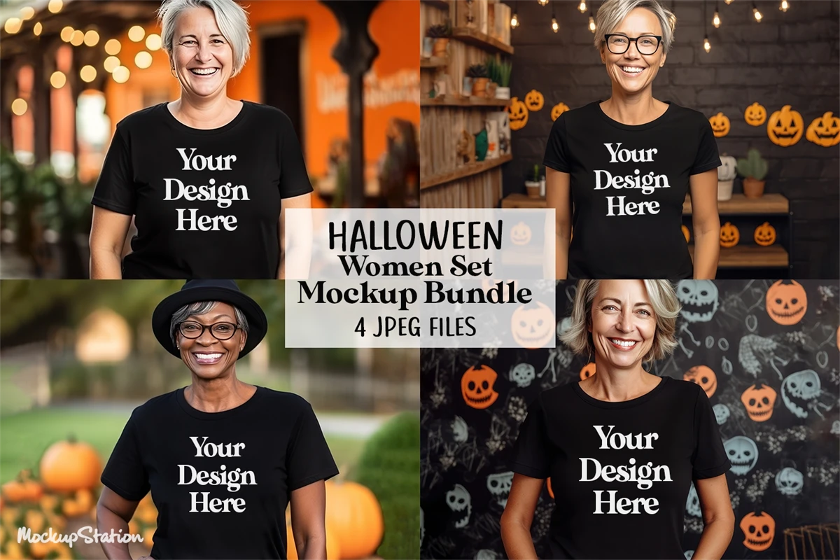 Halloween Women Black T-Shirt Mockup Bundle, Woman Fall Tee Mock Up with Older Model