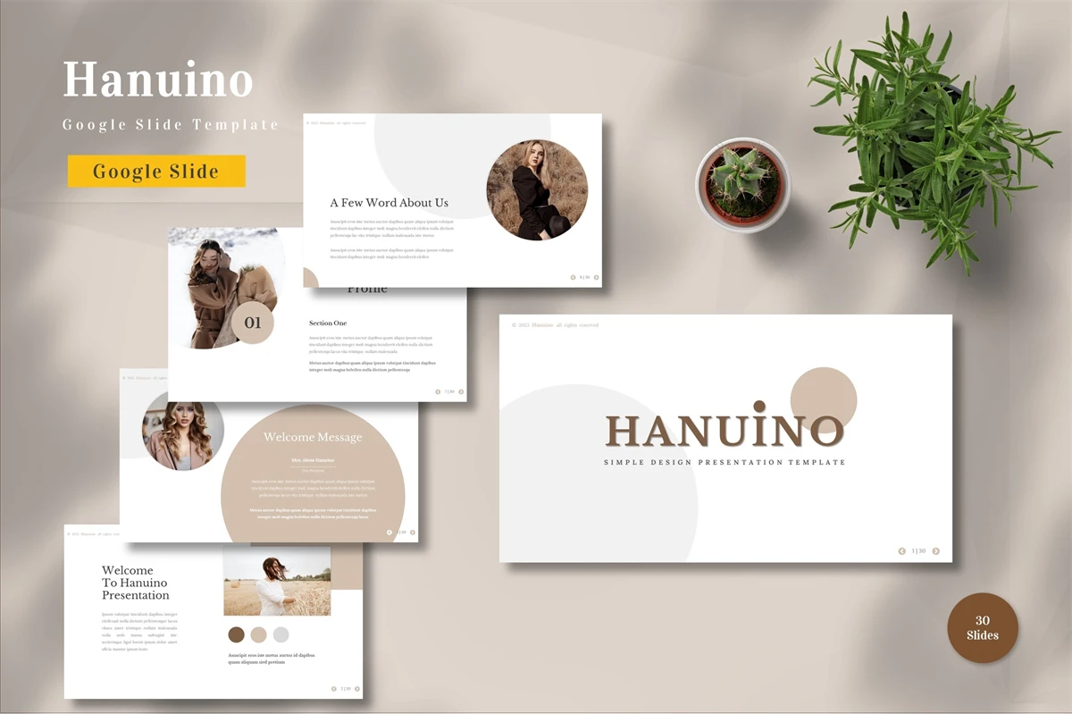 Get it now! **Hanuino - Google Slide Template** for All Business and Personal Needs All elements on this template are editable; input your content, replace your image with a placeholder, change the color, and all presentations include an animated slide to present your slides.