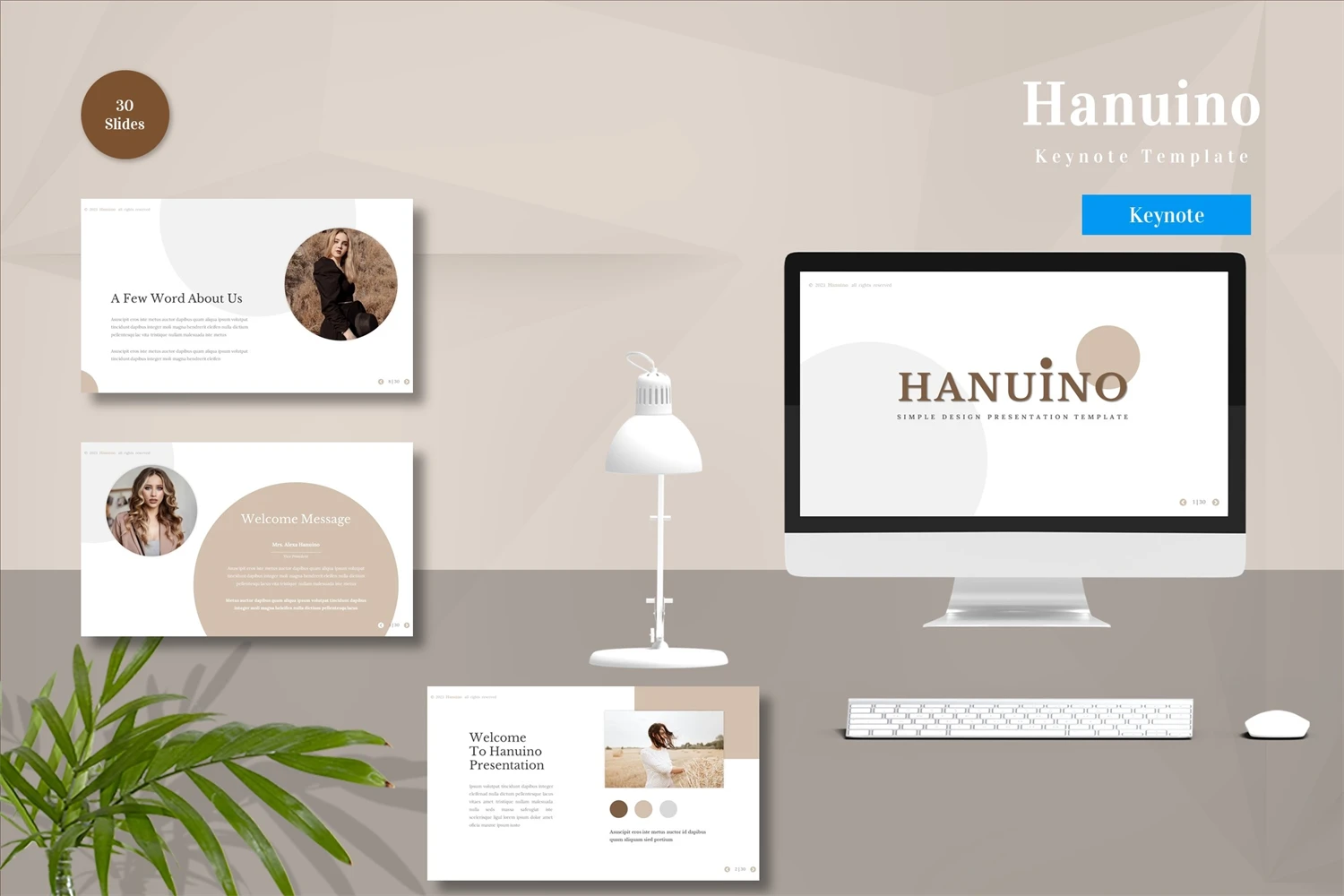 Get it now! **Hanuino - Keynote Template** for All Business and Personal Needs All elements on this template are editable; input your content, replace your image with a placeholder, change the color, and all presentations include an animated slide to present your slides.
