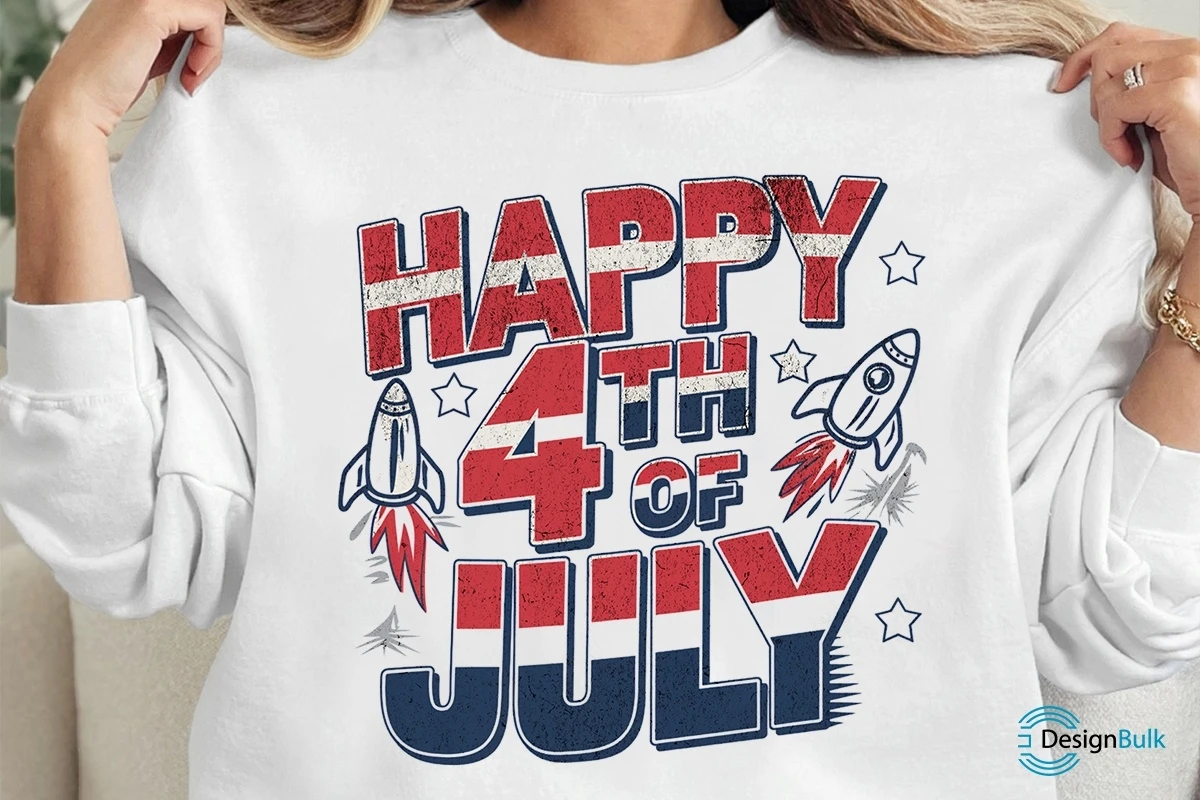 Patriotic Graphics: Includes elements like the American flag, stars, fireworks, and bold typography with phrases such as Happy 4th of July or Land of the Free.