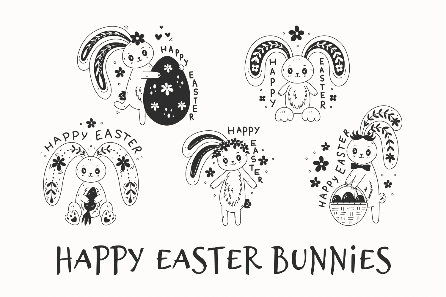 Cute Easter bunnies with eggs, flowers, twigs, branches and handwritten Happy Easter text in doodle style. Black line art rabbits for springtime, holiday, celebration. Cartoon sketch animals for poster, banner, greeting card, invitation. Vector illustration for kids.