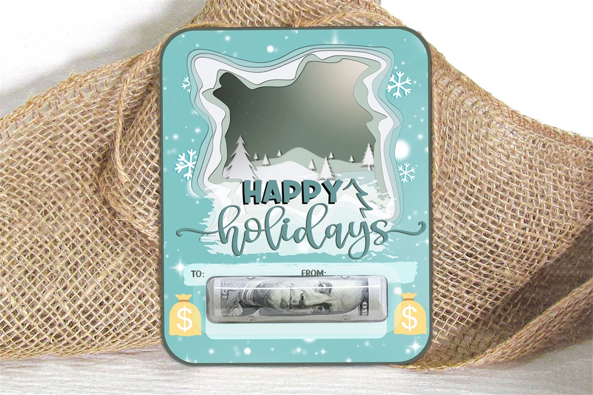 Happy Holidays Christmas Money Card PNG, Snowy Trees Design