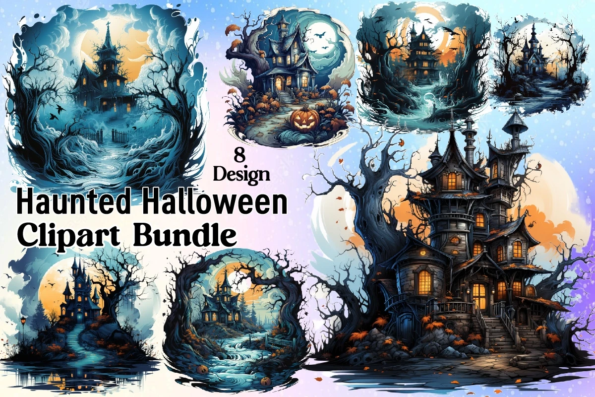 Watercolor Haunted Halloween Clipart PNG Bundle