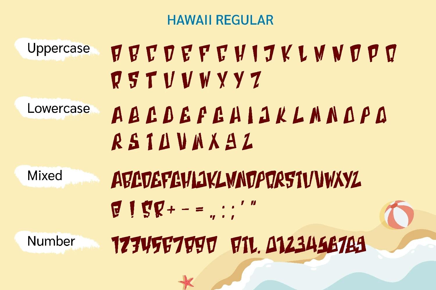 Hawaii is a bold and quirky display font. Its friendly and summery feel makes this font incredibly versatile, fitting a wide range of contexts. Add it to your exotic ideas and notice how it makes them stand out!