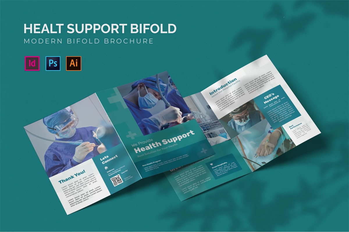 Health Support - Bifold Brochure We present this Bifold Brochure for you, simple and very elegant, and this Bifold Brochure is suitable for all types of your business, made with Adobe InDesign (INDD), Adobe Photoshop (PSD) and Adobe Illustrator (AI), very easy to customize, Hope you Like it, dont forget to rate, Thanks.