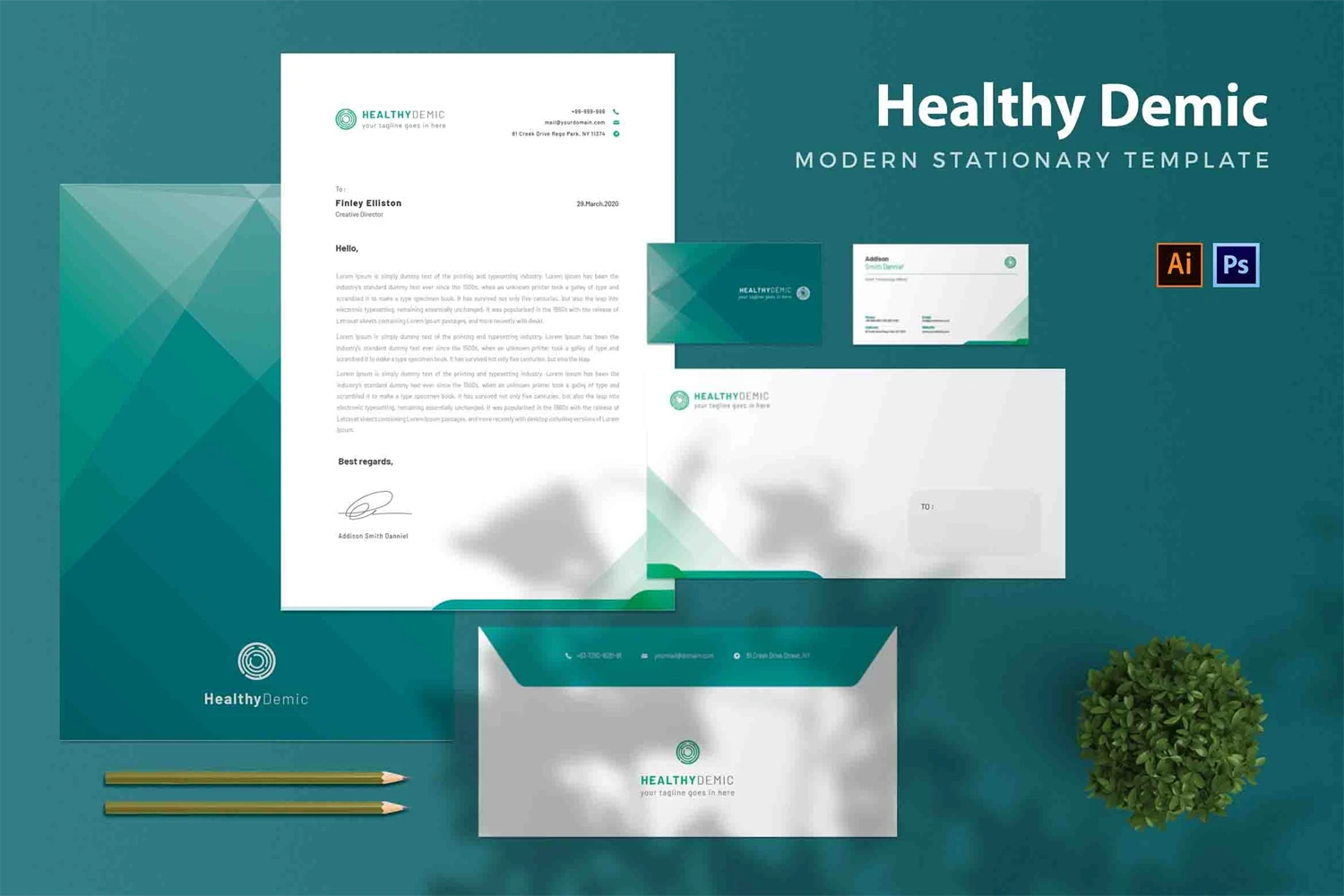 Healthy Demic - Stationary. This template is great for your business and this design will make your interested, elegant, and easily editable according to your needs. I hope you enjoy for this stationary.
