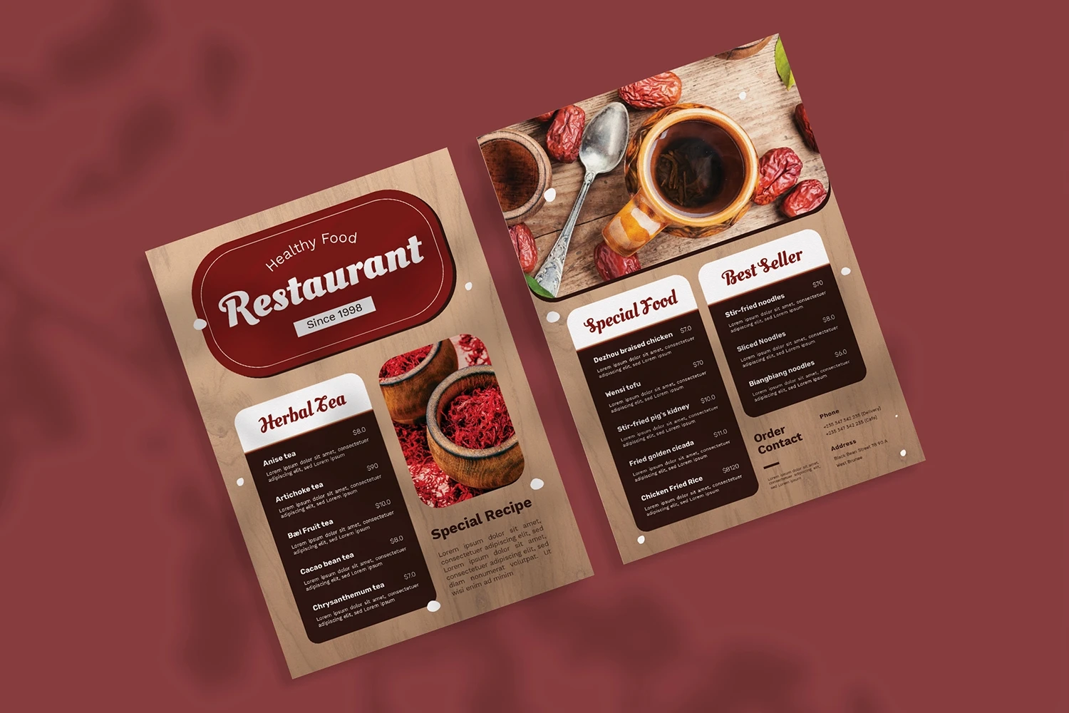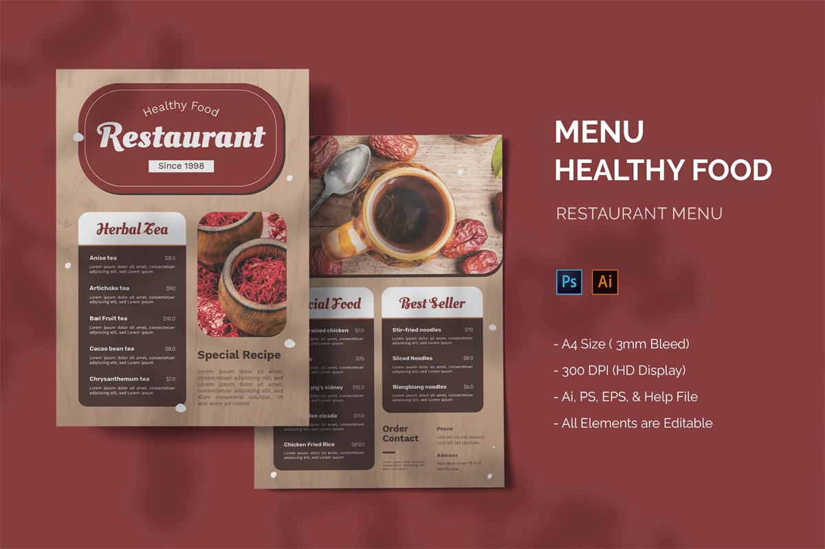 Healthy Food - Restaurant Menu. This template is great for your business and will make your customers interested, elegant, and easily editable according to your needs, this restaurant menu is perfect for, promos, cafes, hotels, resort shops online. etc. I hope you enjoy this restaurant menu