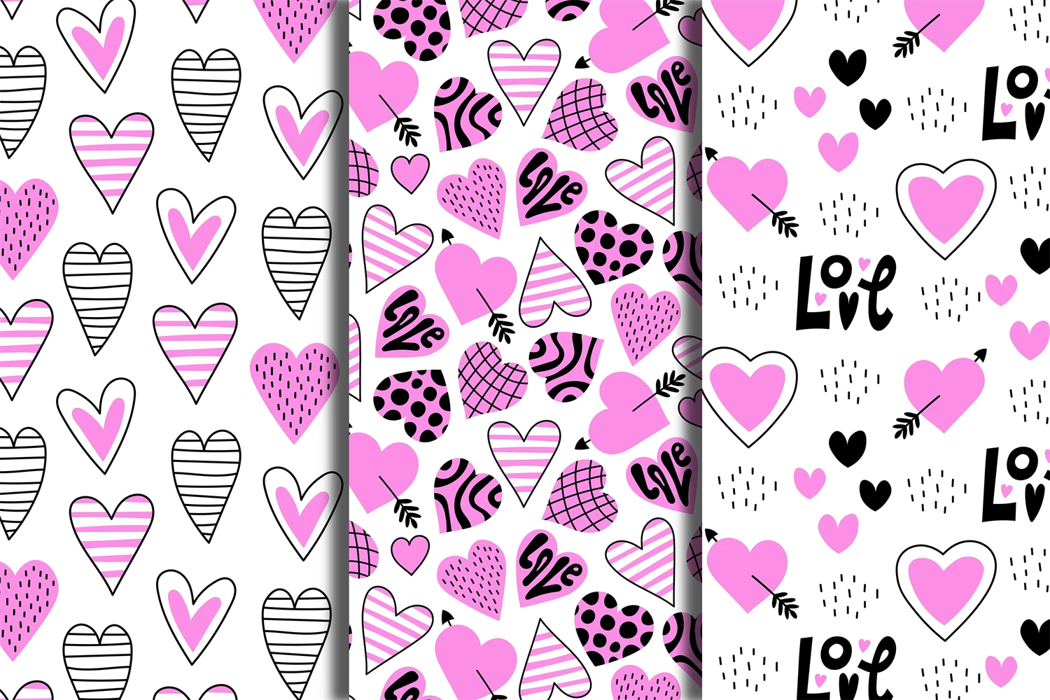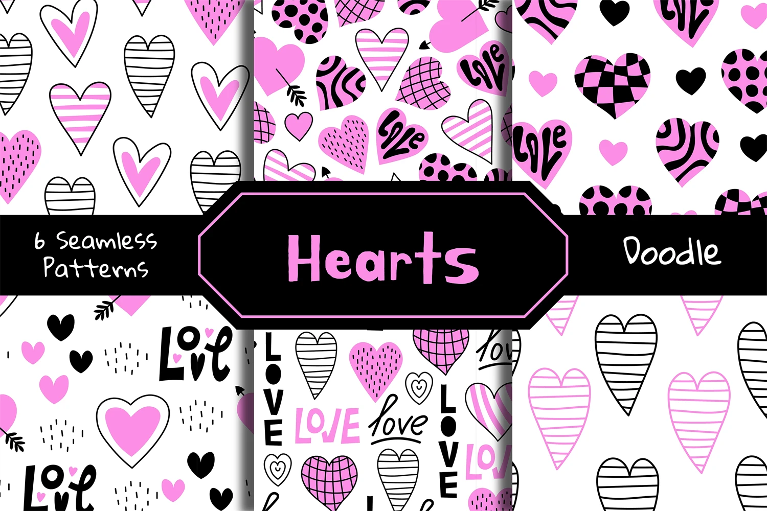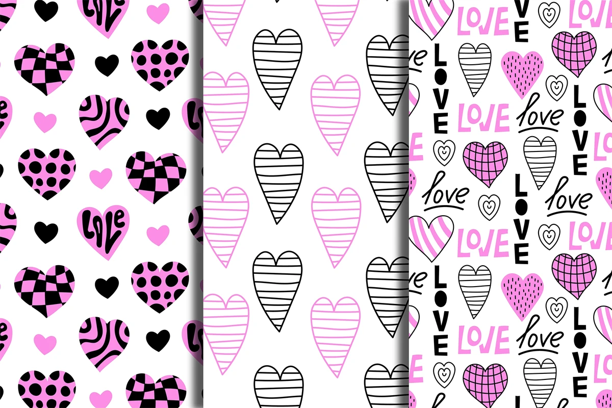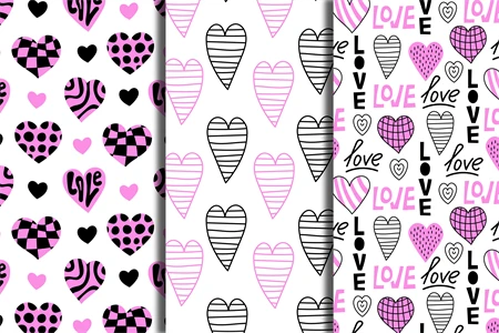 Trendy doodle seamless patterns bundle with funny playful textured hearts. Romantic minimalistic hearts decorated with dots, stripes, lettering and scribbles for wedding design. Modern hand-drawn romantic seamless backgrounds for Valentines Day. Childish cute love digital papers. Y2k Aesthetics. Pinkcore. Sketch style. Vector illustration.