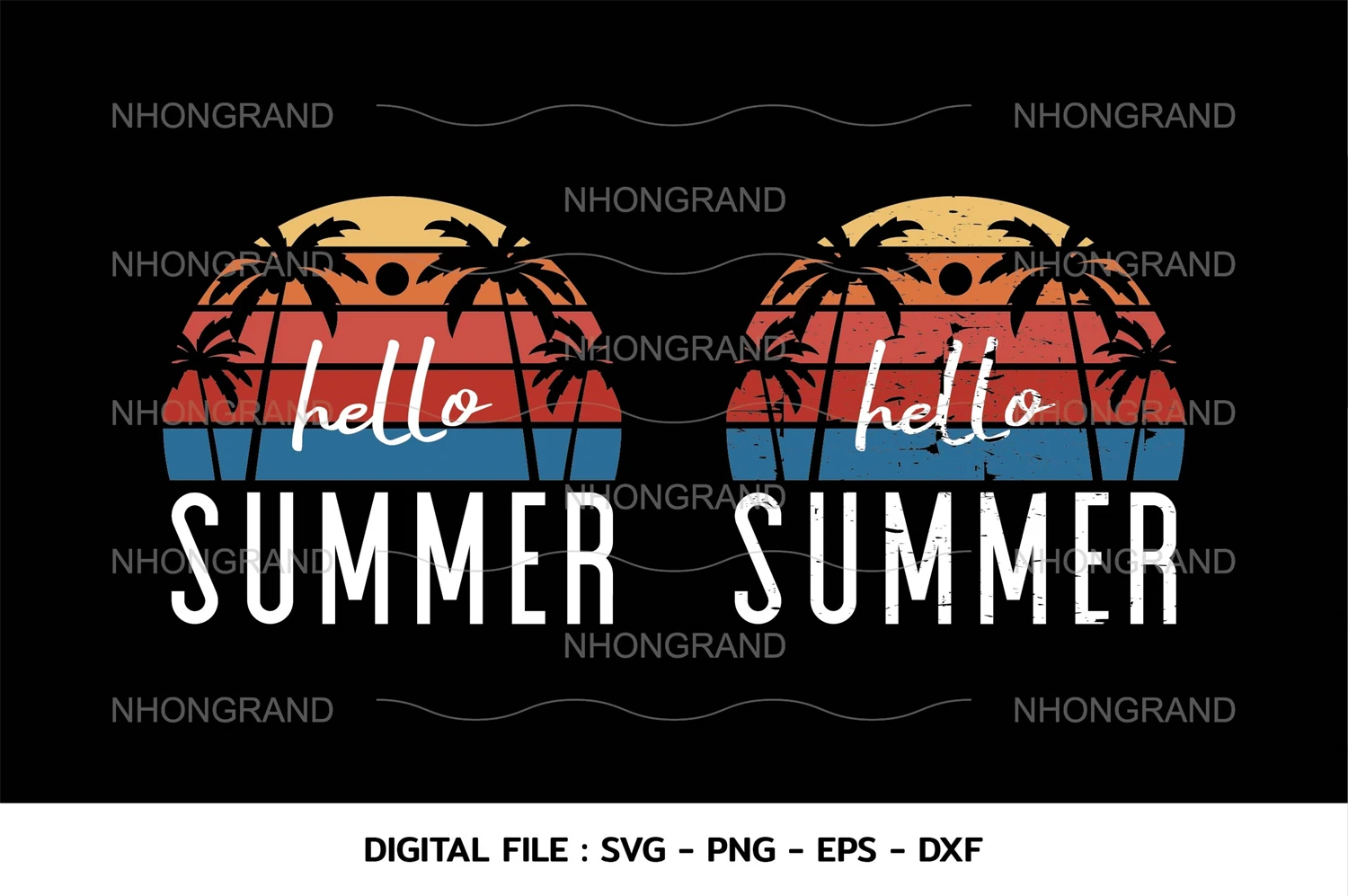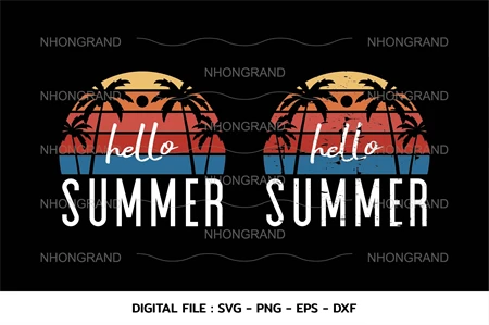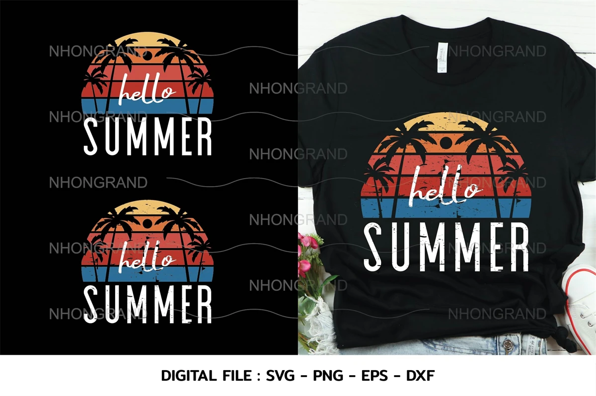 Hello Sumer with beach coconut tree sunset retro Svg, t-shirt, Cricut Files, svg, png, eps, dxf, Instant Download