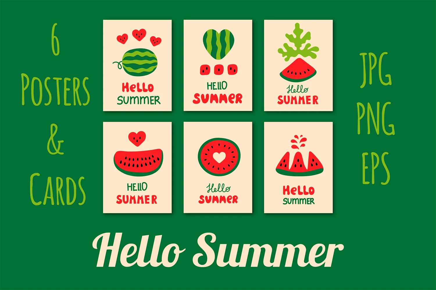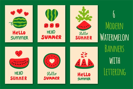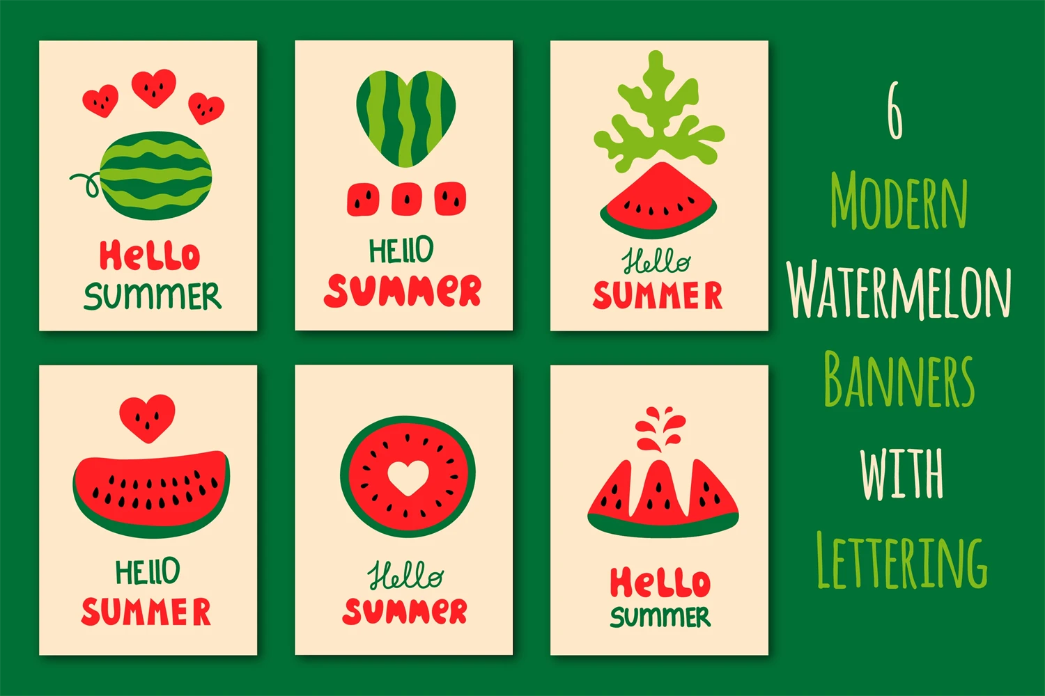 6 trendy minimal fruit posters, cards and banners with summer greeting lettering and cartoon watermelon elements. Cute flat style modern art with juicy fruits for seasonal decorations, party, invitations, greeting cards, covers, etc.