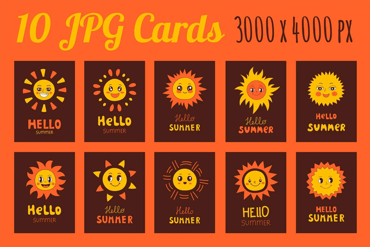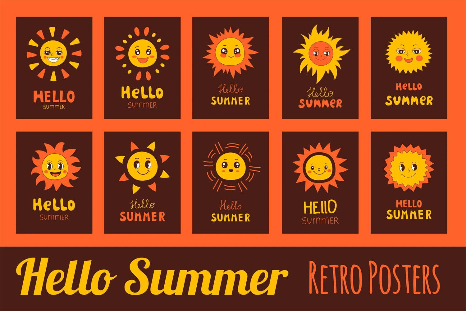 Stylish posters with funny suns characters and handwritten lettering for summer seasonal greeting, cards, banners, decorations. Vintage groovy posters with dark brown backgrounds, inspirational inscriptions are perfect for invitation, party, sublimation.