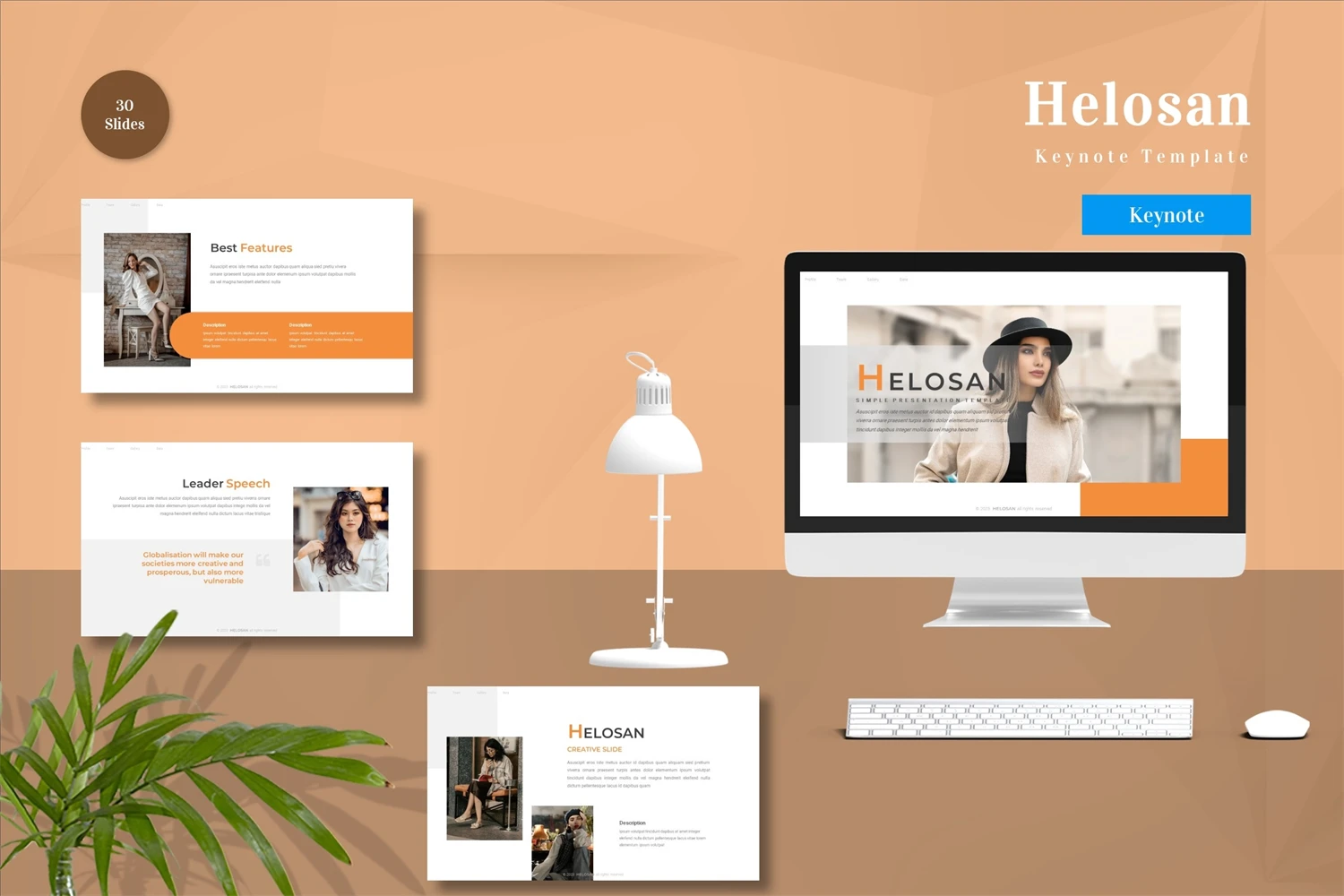 Get it now! **Helosan - Keynote Template** for All Business and Personal Needs All elements on this template are editable; input your content, replace your image with a placeholder, change the color, and all presentations include an animated slide to present your slides.