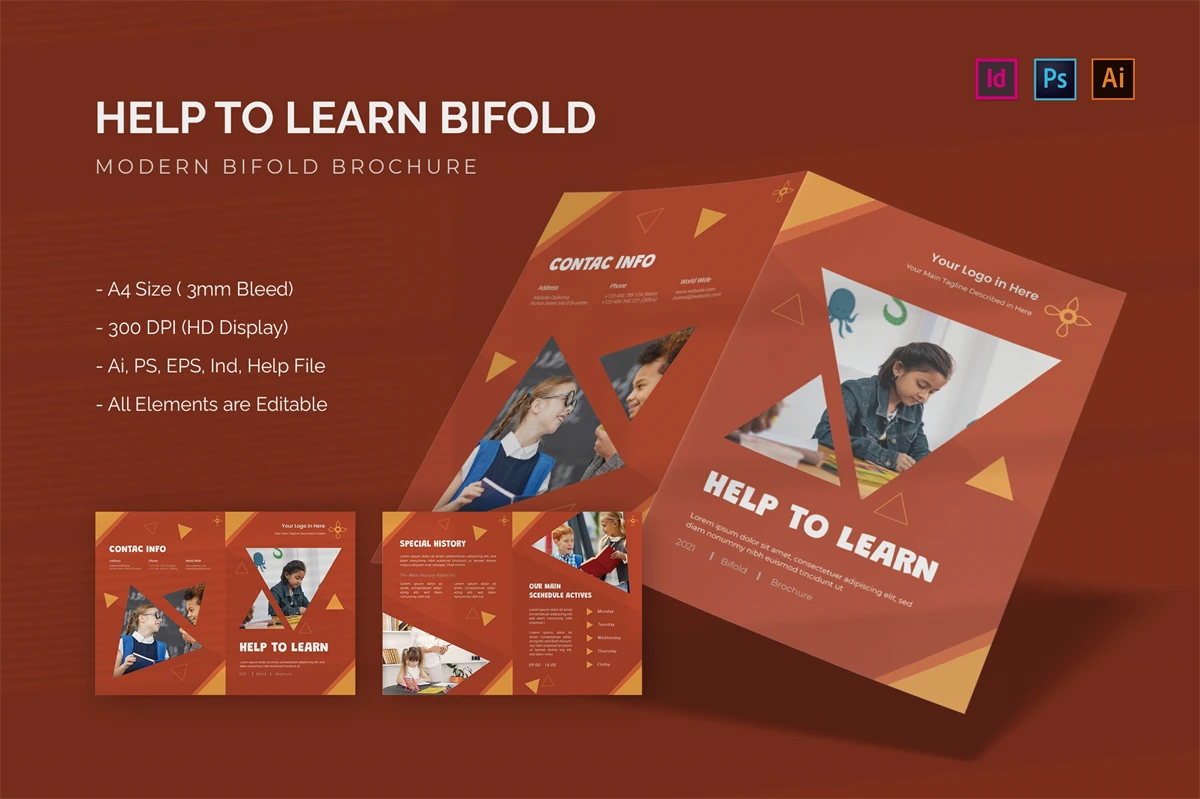 Help to Learn - Bifold Brochure We present this Bifold Brochure for you, simple and very elegant, and this Bifold Brochure is suitable for all types of your business, made with Adobe InDesign (INDD), Adobe Photoshop (PSD) and Adobe Illustrator (AI), very easy to customize, Hope you Like it, dont forget to rate, Thanks.