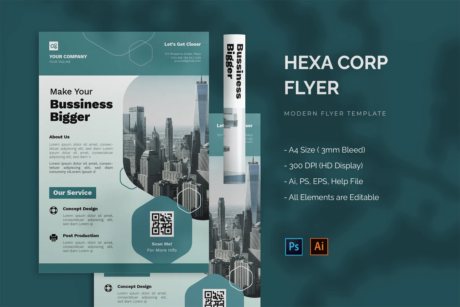 Hexa Corp - Flyer. This Flyer template is designed for your company's business needs. very clean and elegant, and also easily edited and adjusted to your liking