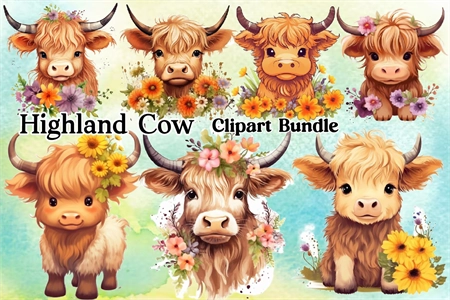 Watercolor Highland Cow Clipart PNG Bundle