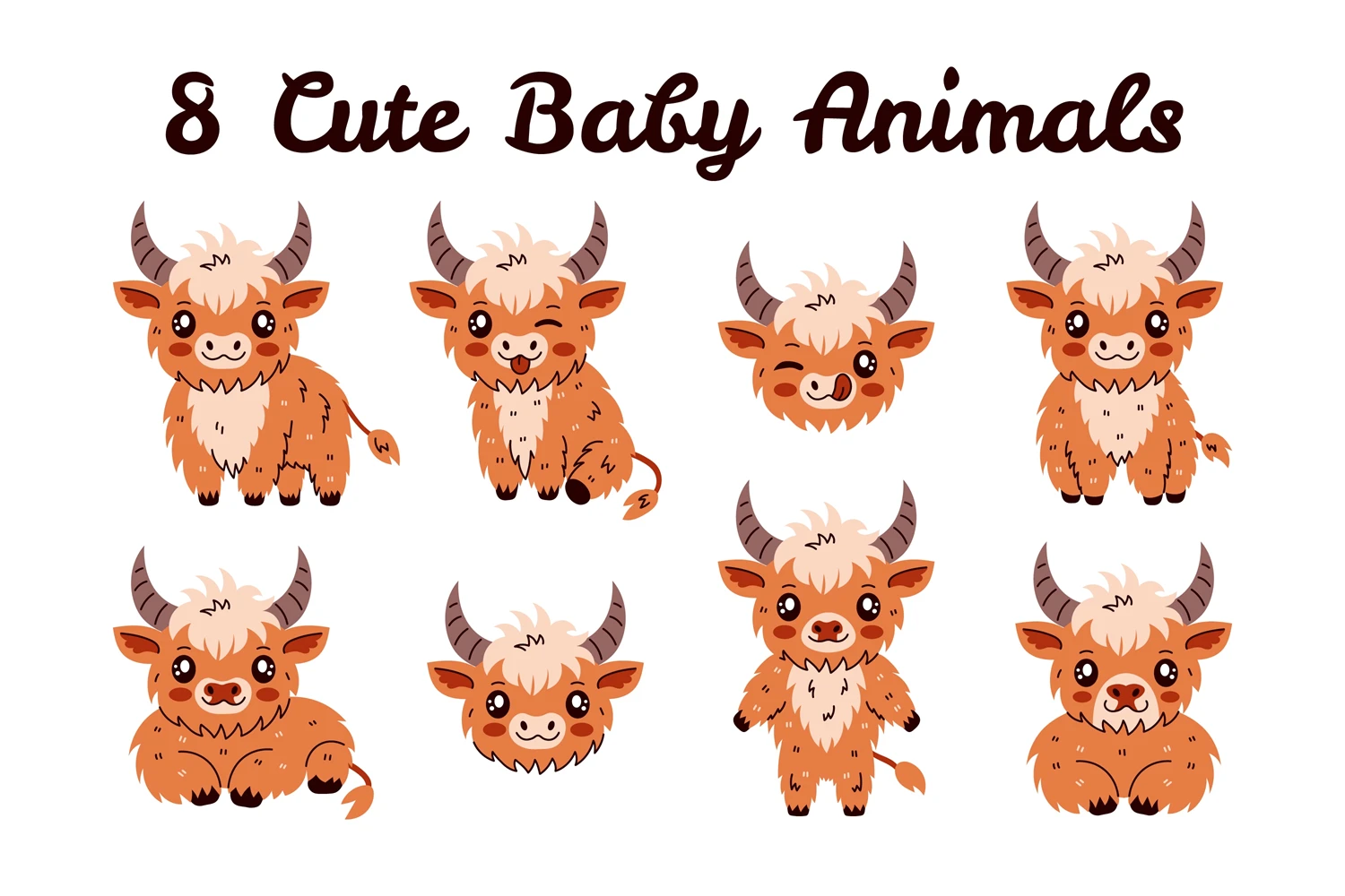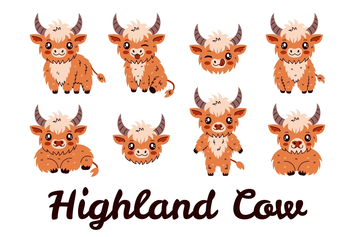 Highland breed of rustic cattle. Cute cow character design. Baby animals. Vector illustration in cartoon style. Modern Highland cattle clipart. Shaggy horned cow. Perfect for kids, stickers, posters, banners, sublimation.