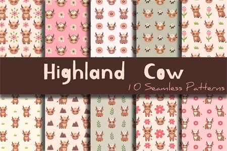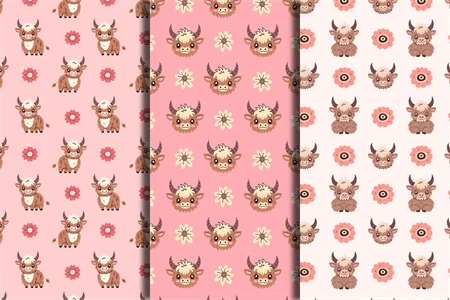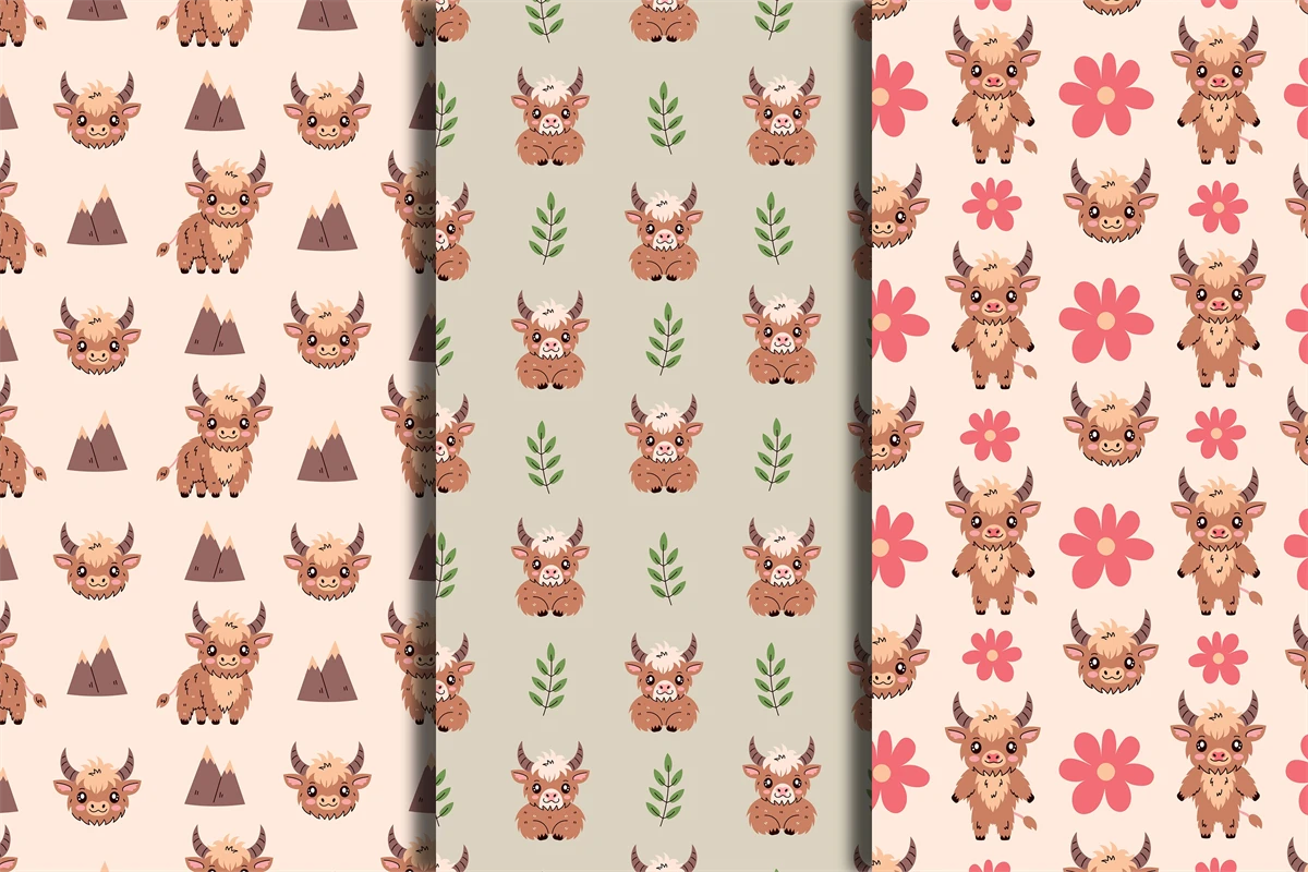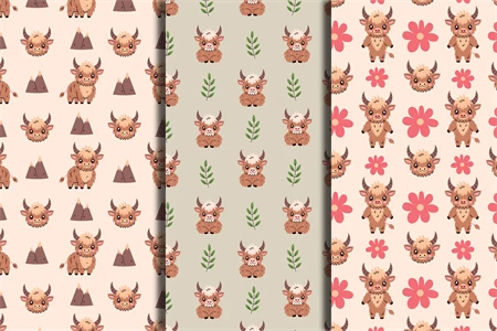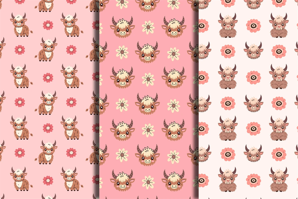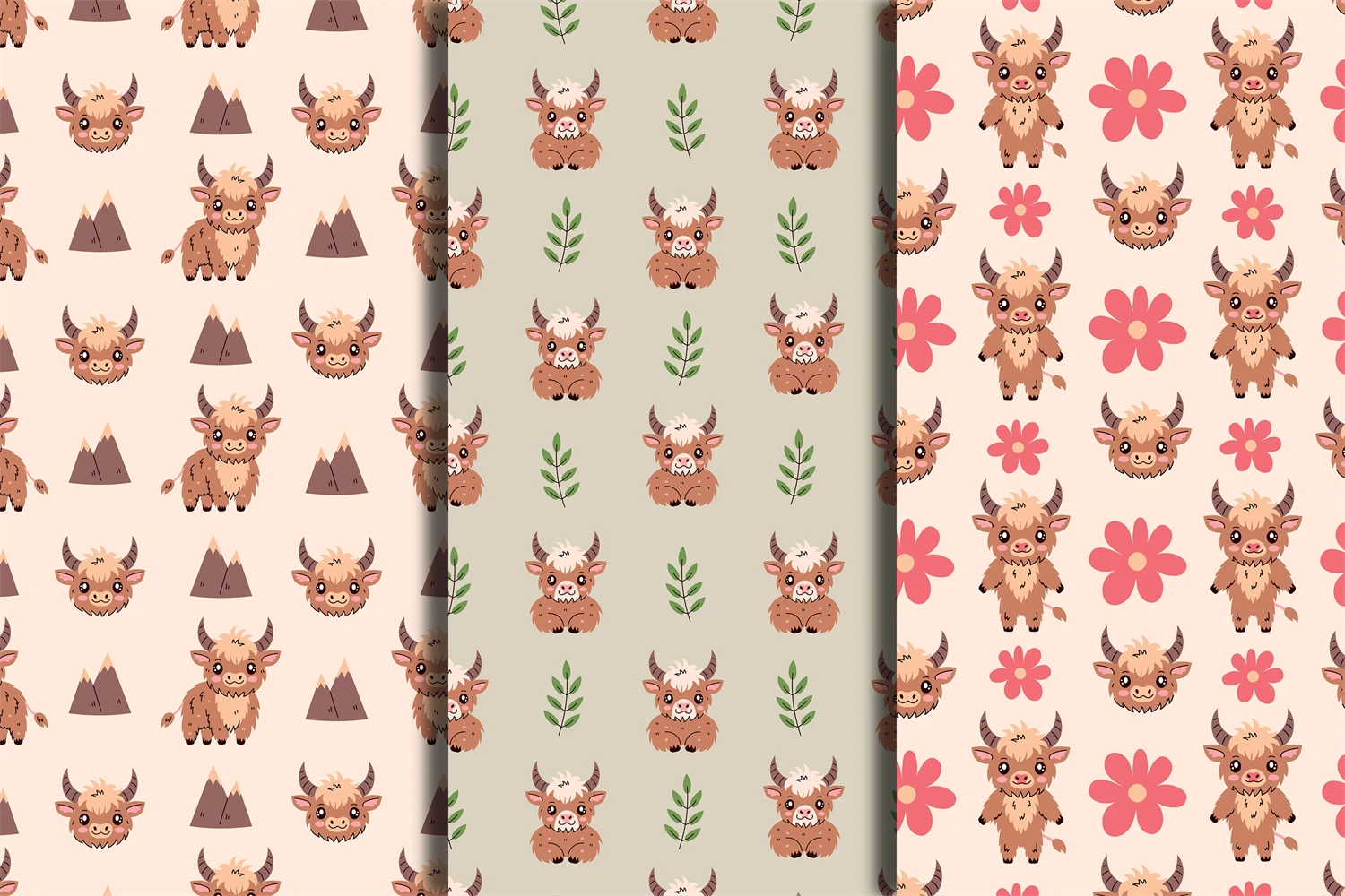 Cute childish pastel colored seamless patterns bundle with Highland cow character, flowers, branches, twigs. Adorable horned baby animal background in cartoon flat style. Modern colorful wildlife digital papers. Repeat vector illustration for kids, milk, dairy products, ornament, decoration, fabric, etc. Livestock, farm animal, Scottish cattle, pasture theme.
