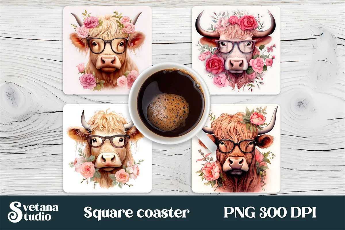 Use these highland cow square coaster sublimation designs to create square coaster for you and your friends.