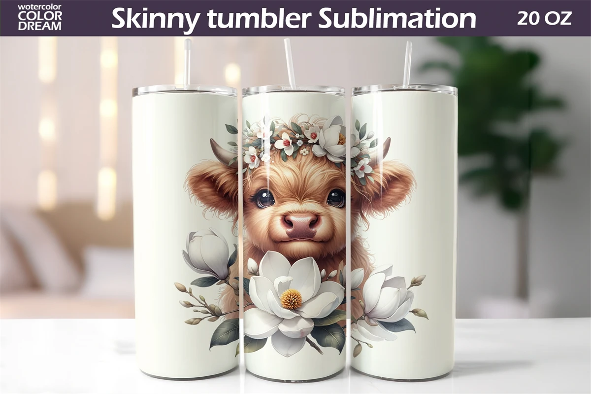 Cute Cow Magnolia Tumbler. Highland Cow Flowers Tumbler