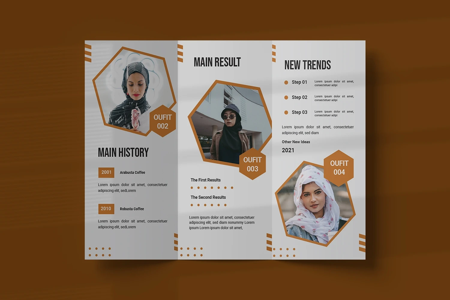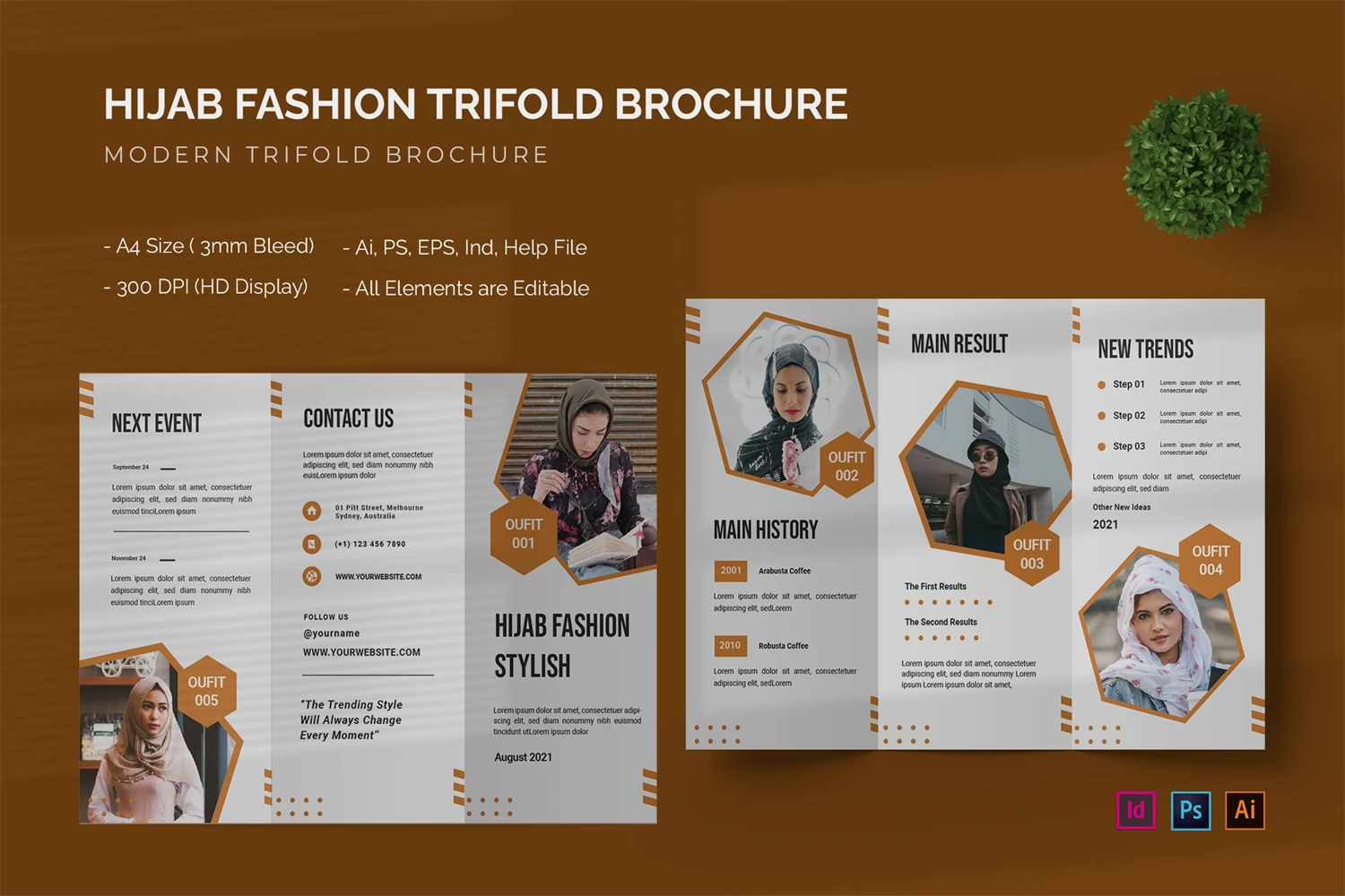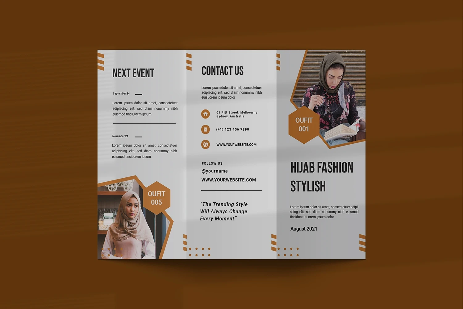 Hijab Fashion Stylish - Trifold Brochure We present this Trifold Brochure for you, simple, very elegant and professional and this Trifold Brochure is suitable for all types of your business,company or corporate, made with Adobe InDesign (INDD), Adobe Photoshop (PSD) and Adobe Illustrator (AI), very easy to customize, Hope you Like it dont forget to rate, Thanks You.