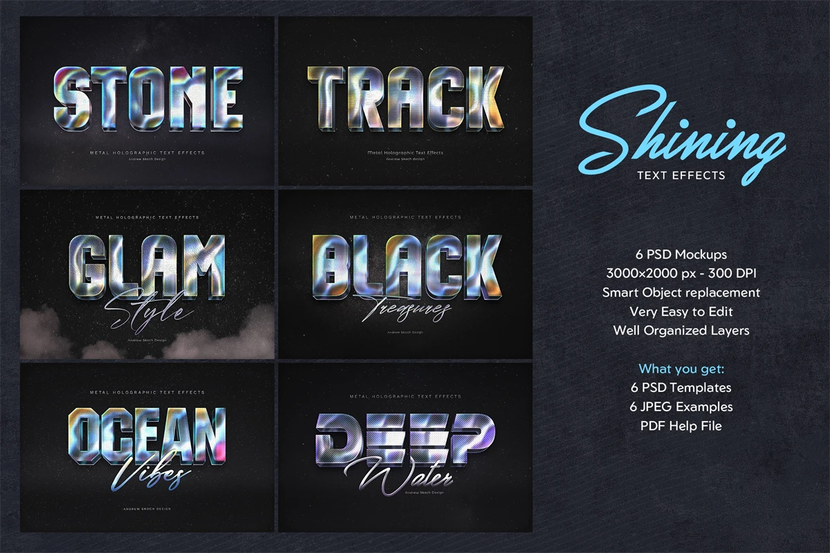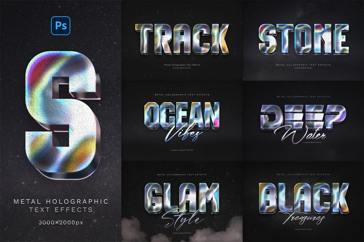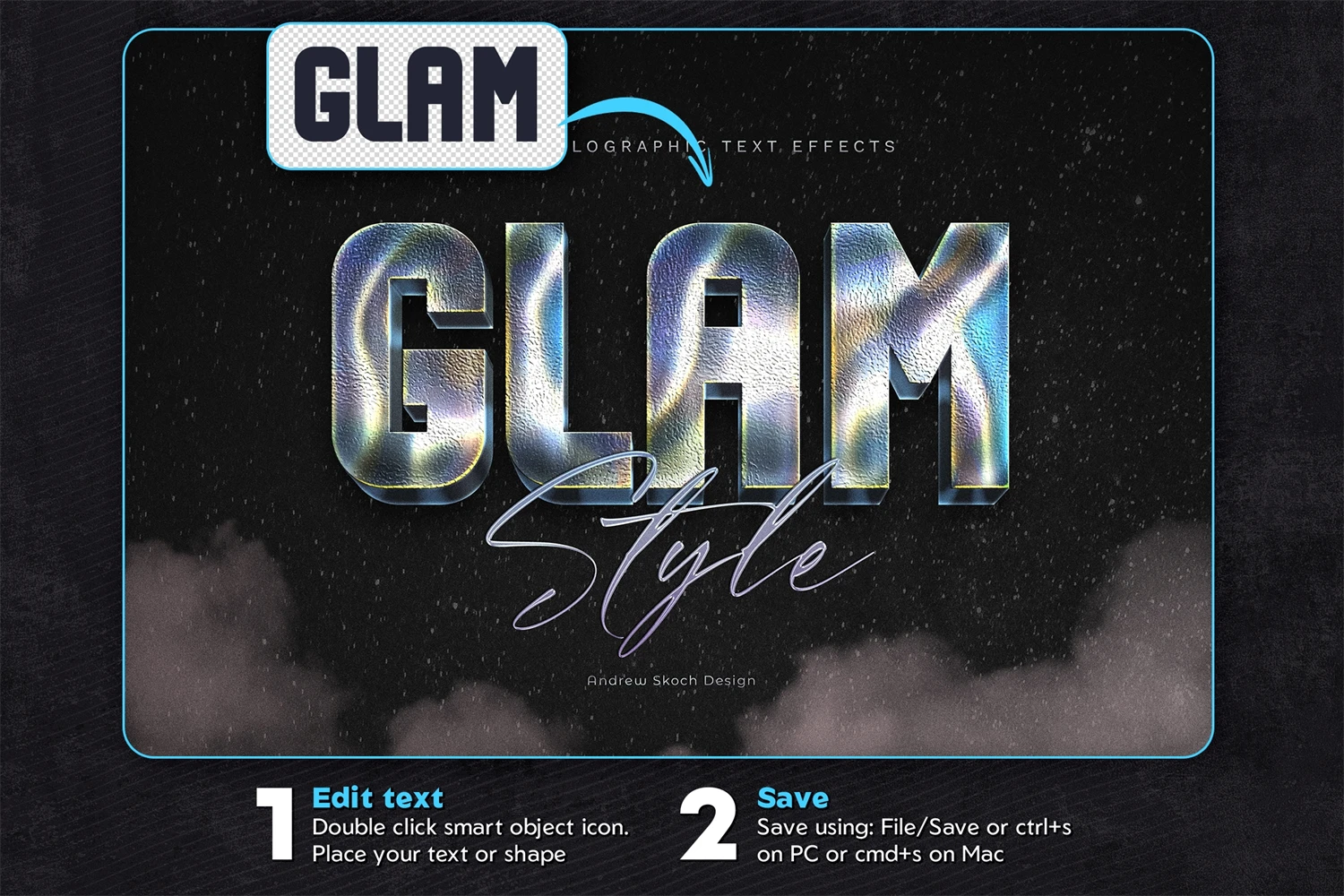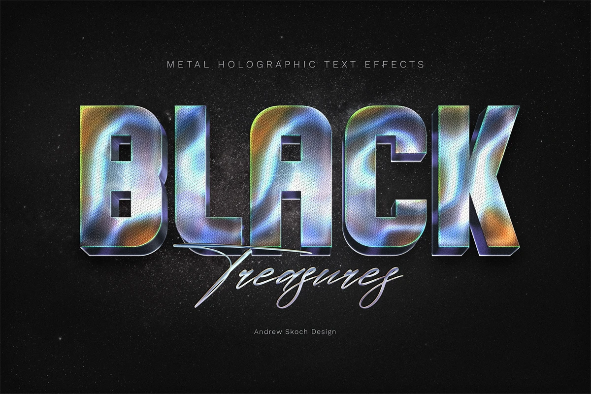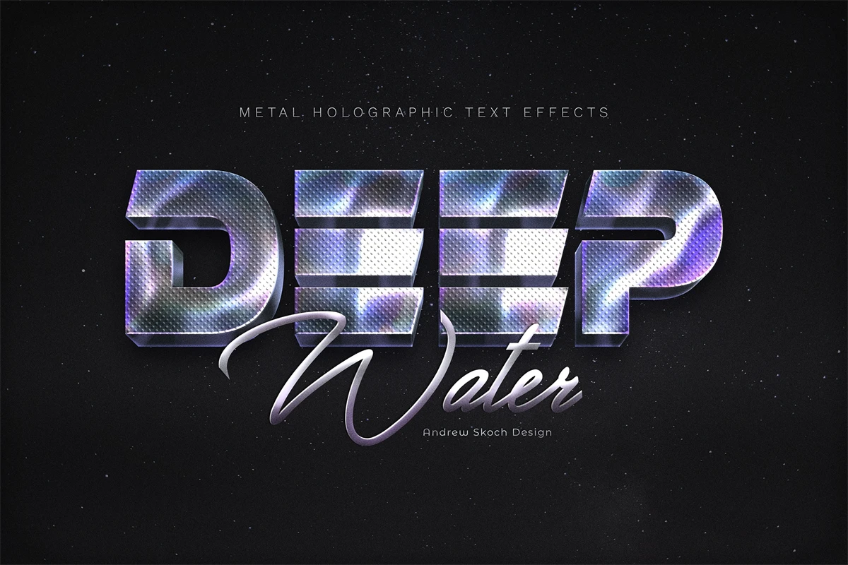The holographic design trend has been a huge hit for several years. Be trendy with 6 shiny holographic effects. Its an easy way to present your text, shape or logo in cool shining style. Textured holochrome letters with glowing holographic effect.