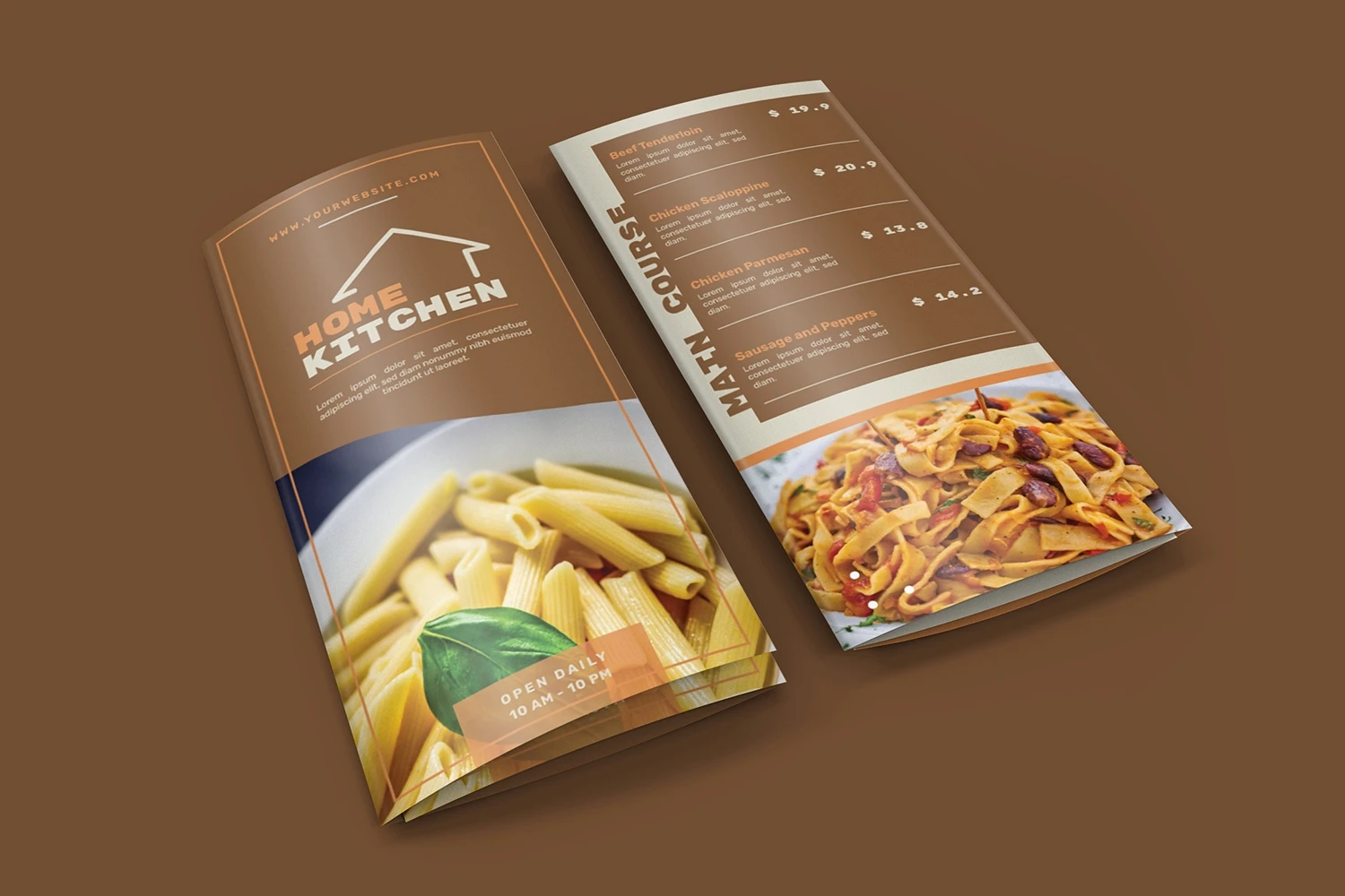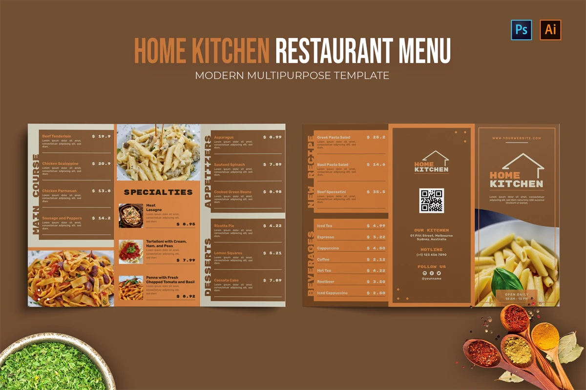 Home Kitchen - Restaurant Menu. This template is great for your business and will make your customers interested, elegant, and easily editable according to your needs, this restaurant menu is perfect for, promos, cafes, hotels, resort shops online. etc. I hope you enjoy this restaurant menu