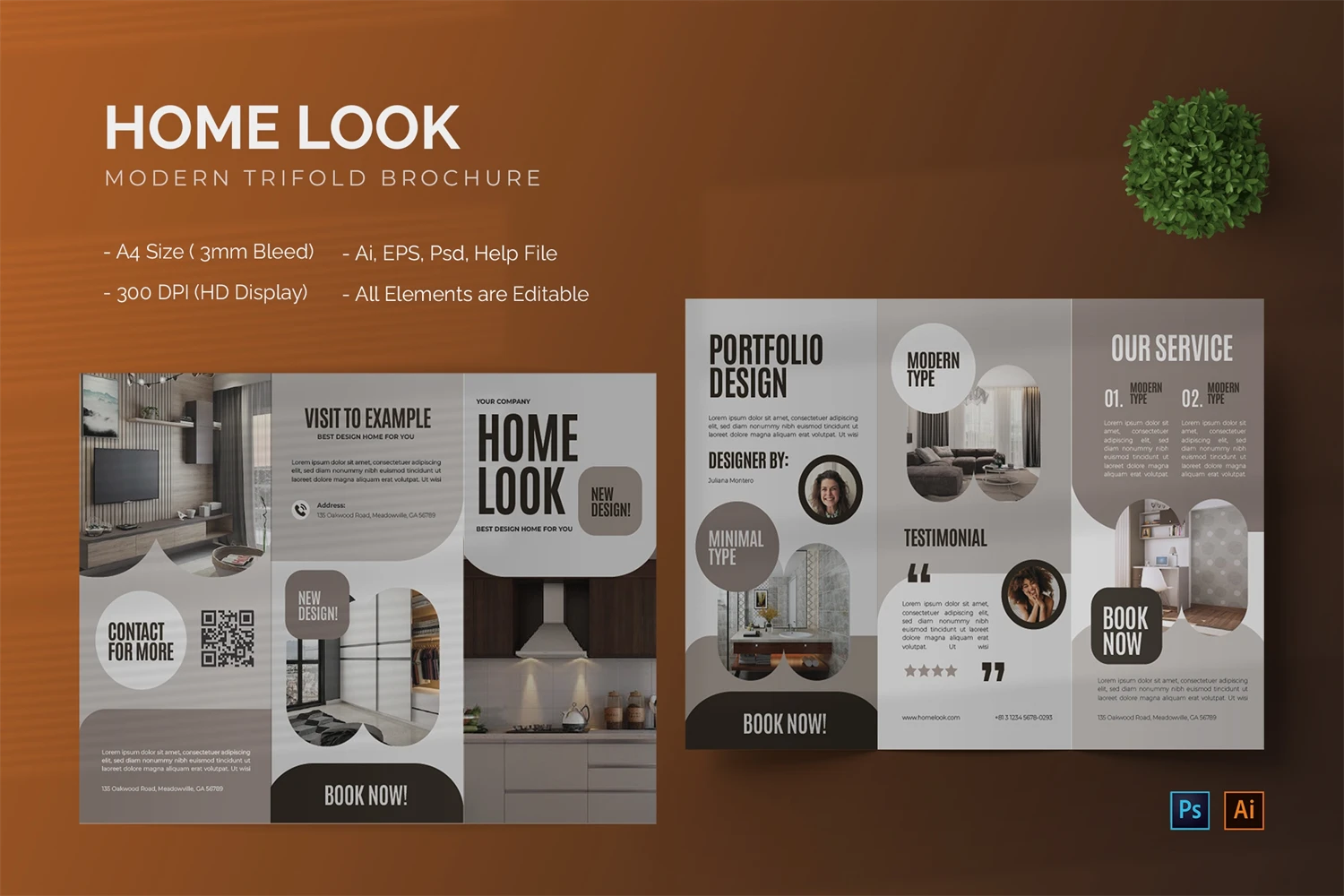 Home Look - Trifold Brochure This type of brochure is split into three equal parts to make three panels when information about your brand can be displayed. Use this template because it's easy to edit!