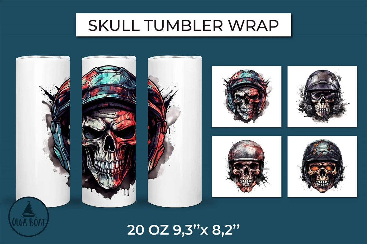 Boys tumbler sublimation design with skull in biker helmet perfect for horror sublimation wrap 20 oz.