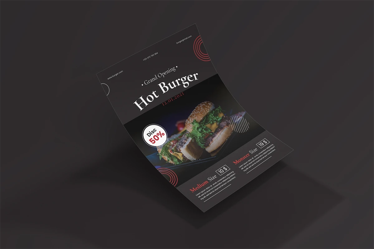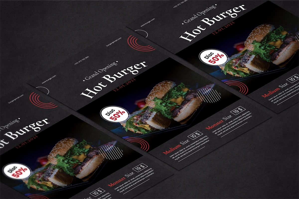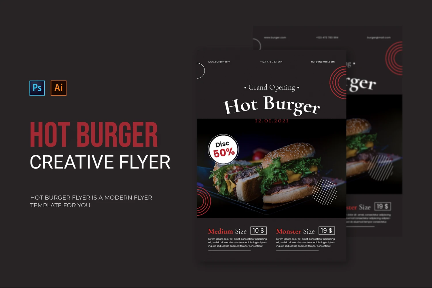 Hot Burger - Flyer. This Flyer template is designed for your company's business needs. very clean and elegant, and also easily edited and adjusted to your liking