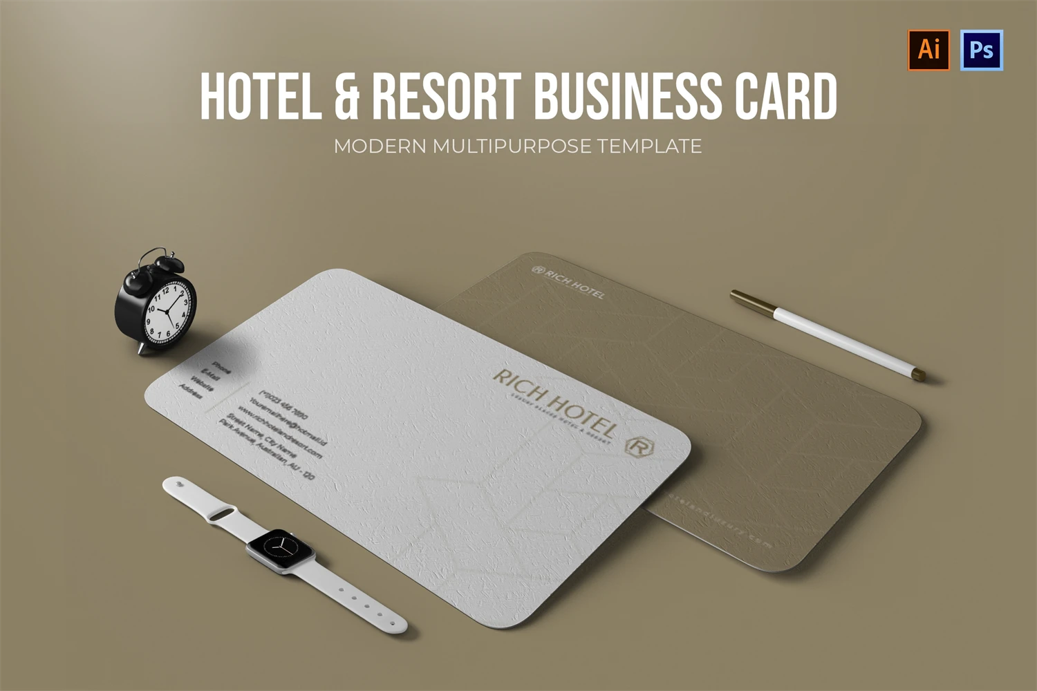 This Hotel & Resort - Business Card make your business cards look professional. You can use this business card for, identity, company business cards, Corporate Business, Creative, Blogs, Photographers, Artists, Designers, etc.
