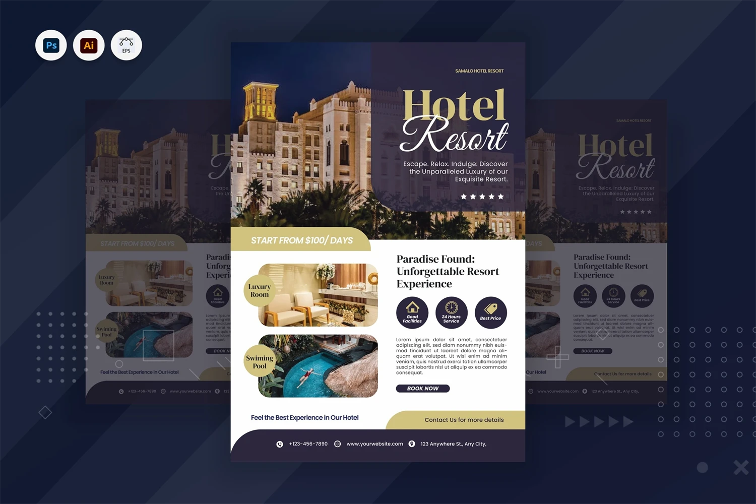 Here is our business Poster template! This is creative and corporate style Poster template, **Hotel Resort Poster**- Get it now!,great Poster template for All business and personal needs. All elements on this template are editable from Ai & EPS tools, input your content, replace your image with a placeholder, change the color, and, all templates include professional layouts and present your template to the world. This design will great for promoting Specification