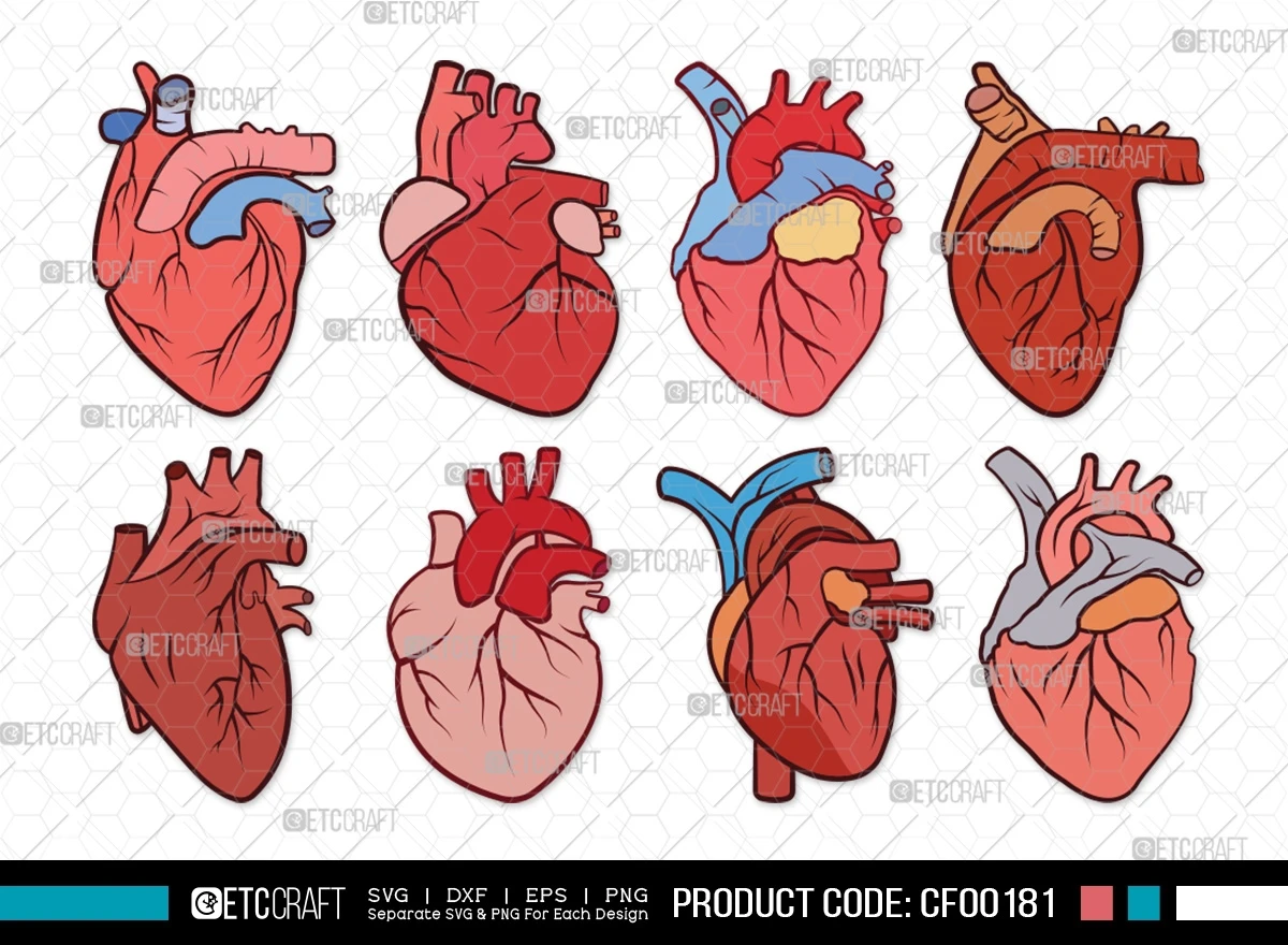 Explore the intricate beauty of human anatomy with our Human Heart Clipart Medical Realistic Anatomical Heart SVG Cut File Bundle. This digital collection showcases a variety of meticulously designed SVG, DXF, EPS, and PNG files, presenting anatomically accurate human heart clipart. Whether you're a medical professional, student, or simply seeking to add a touch of realism to your designs, this bundle is the perfect choice.
