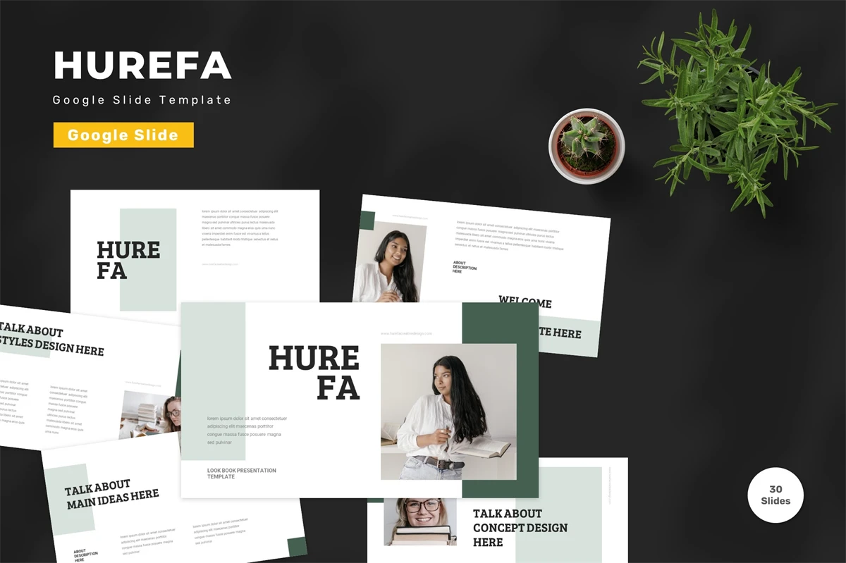 Get it now! **Hurefa - Google Slide Template** for All Business and Personal Needs All elements on this template are editable; input your content, replace your image with a placeholder, change the color, and all presentations include an animated slide to present your slides.
