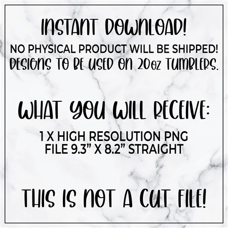 This listing is for an instant downloadable file designed to be used on 20oz skinny tumblers. No physical products will be shipped as this is an instant download. Refunds and/or cancellations are not permitted on digital downloads. Please contact me if you have any issues with the files.