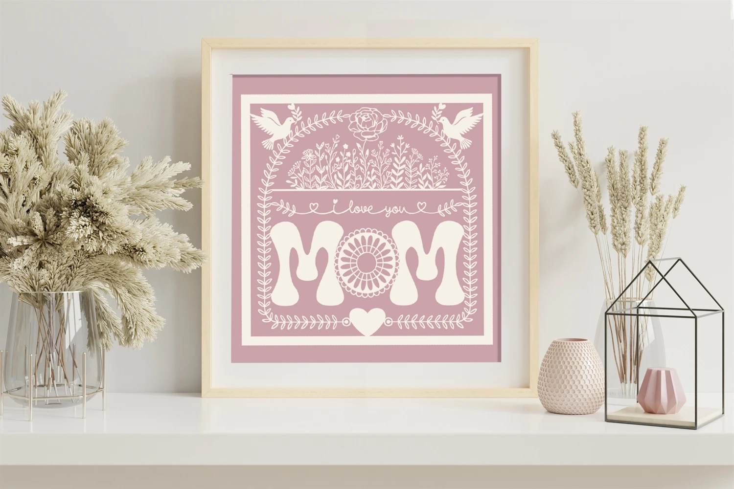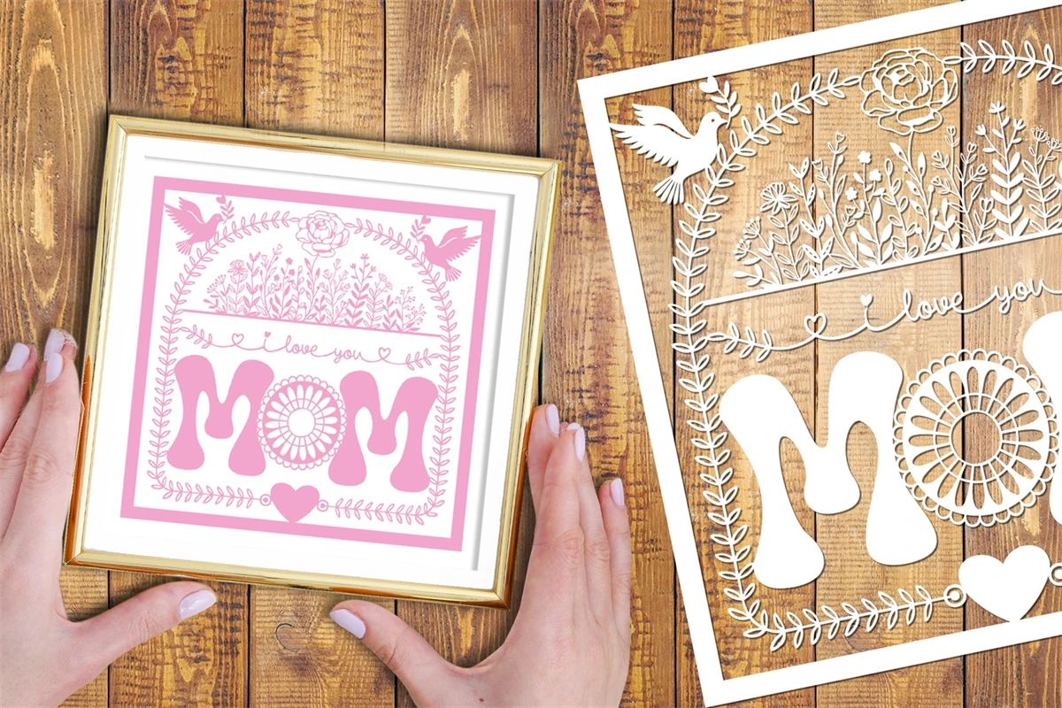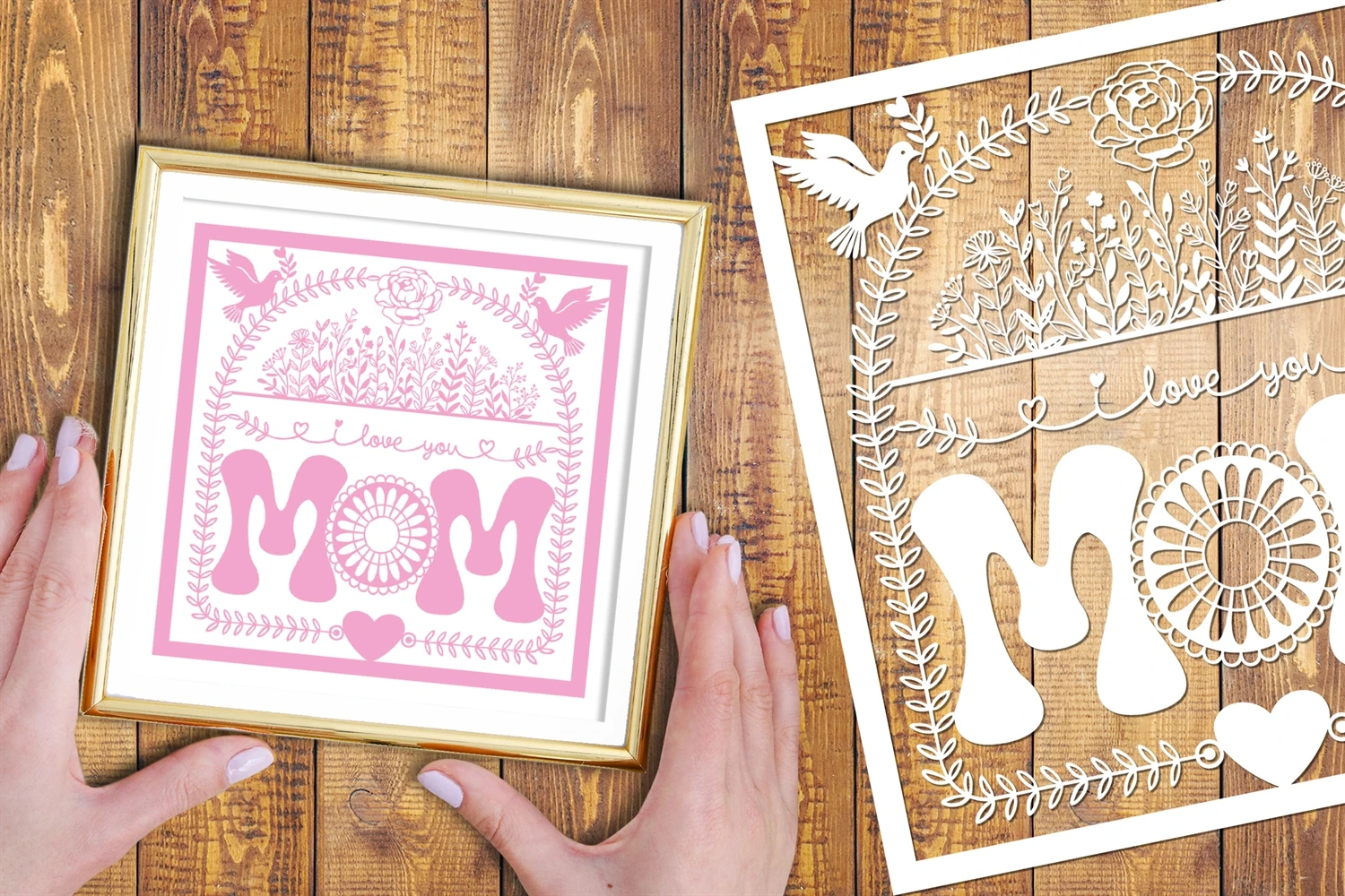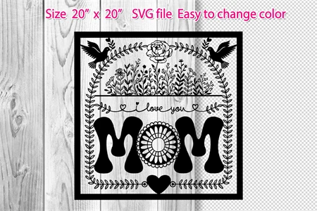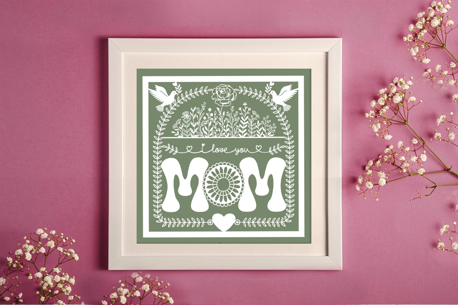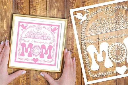 I Love You MOM Papercut SVG Clipart Cut Files for Mothers Day Gift Idea in Pink Tone color for your creative DIY projects, and gift ideas for Mothers Day. Perfect for the papercut, scrapbooking, card stock, Wall art, home decor, wedding decor, and other DIY projects. Options are endless!