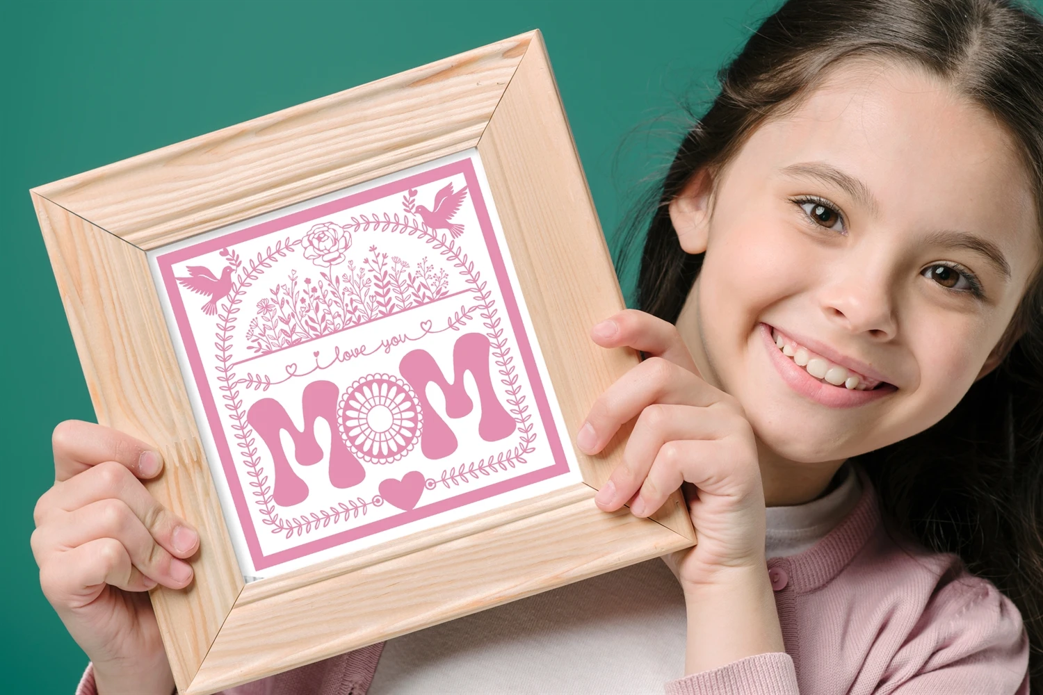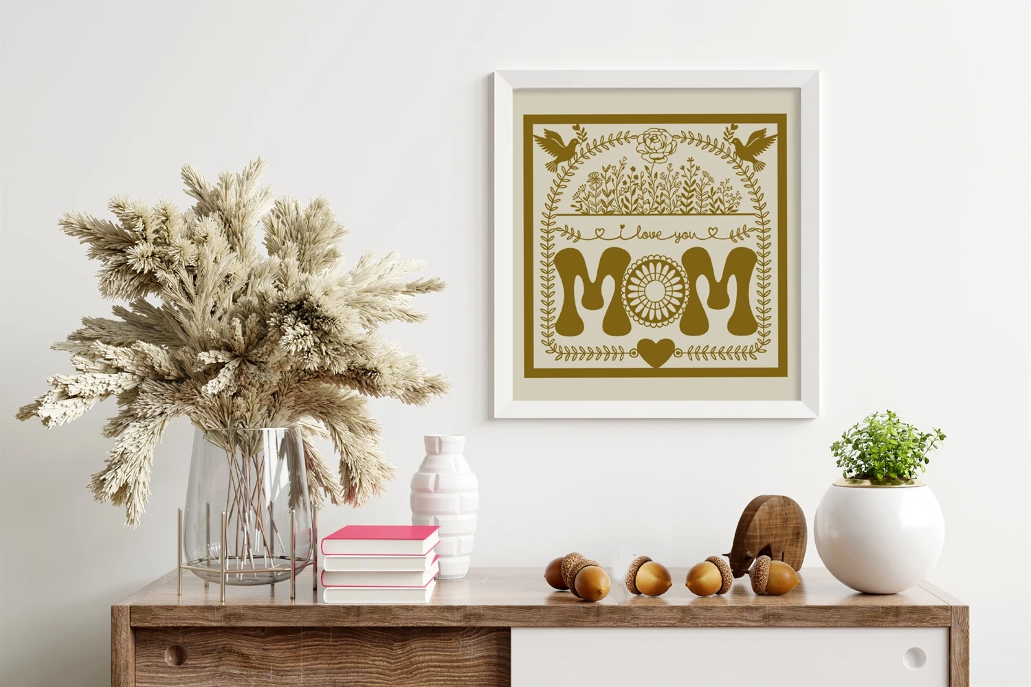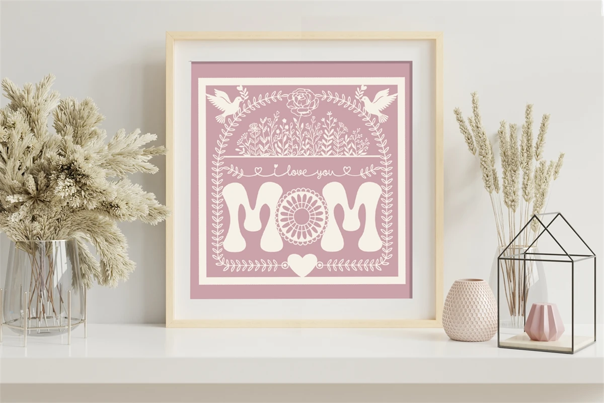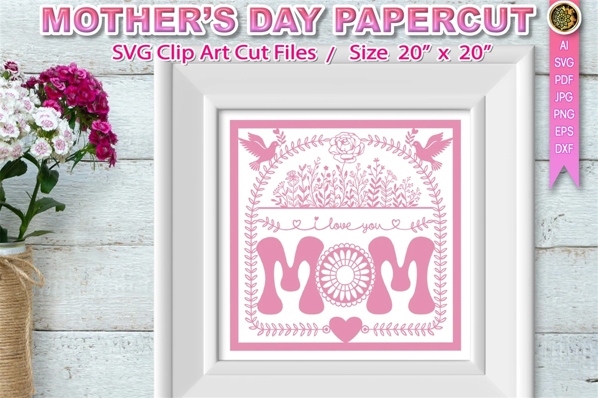 I Love You MOM Papercut SVG Clipart Cut Files for Mothers Day Gift Idea in Pink Tone color for your creative DIY projects, and gift ideas for Mothers Day. Perfect for the papercut, scrapbooking, card stock, Wall art, home decor, wedding decor, and other DIY projects. Options are endless!